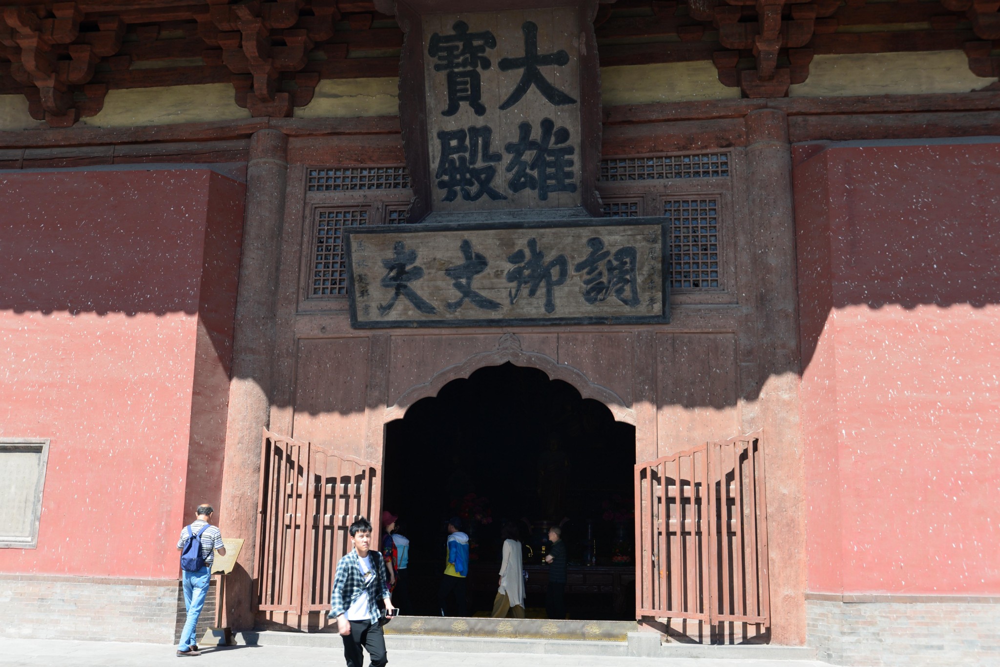 山门正面是普光明殿,气势宏伟,高悬普光明殿金字匾额,毗卢遮那佛音译为“光明普照”,大殿由此得名。两旁海蓝色金字楹联:“世事熙熙从来富贵无了局到此说了就了,人生攘攘自古名利难放下如斯当放便放”。