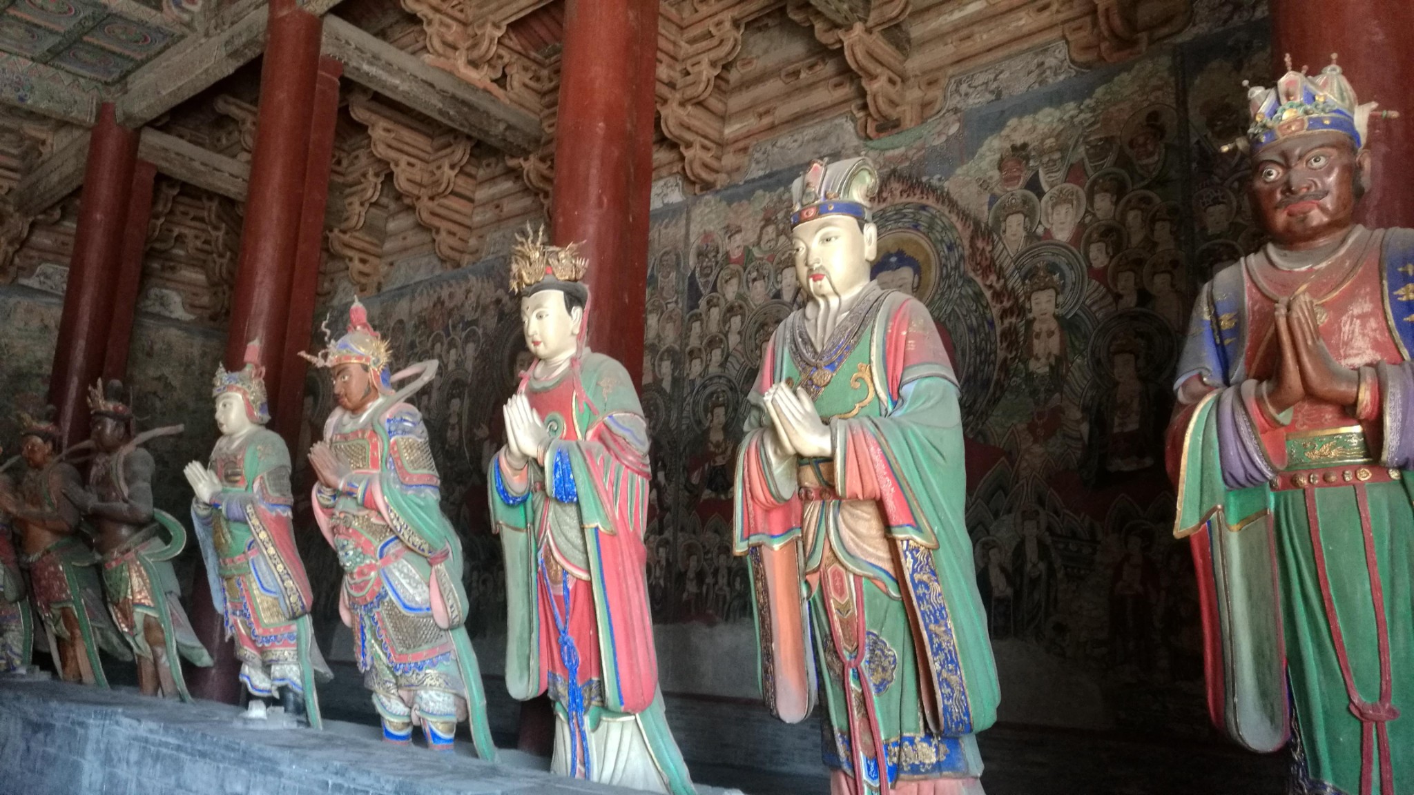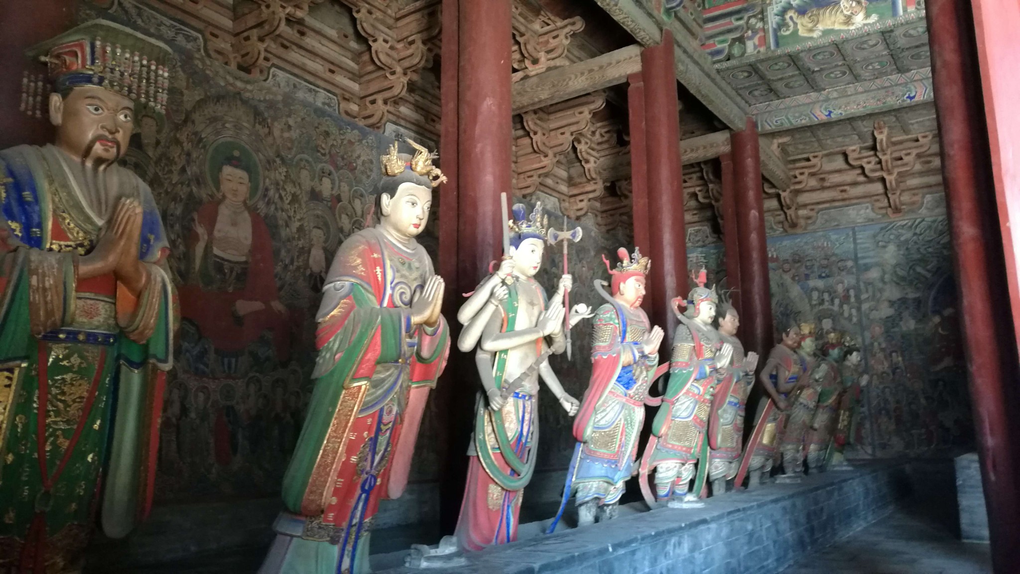 在五方佛左右两侧的砖台上,有二十诸天肃立,身躯前倾15度,形态各异。武将身披甲胄,手持兵刃,露出交战时的神情。