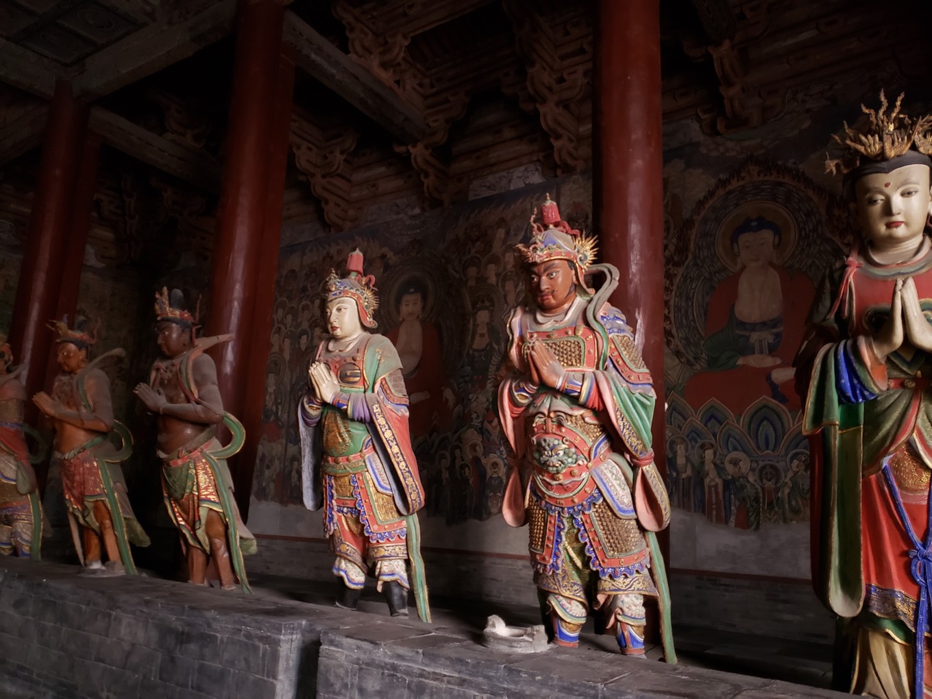 大殿面阔七间,重檐歇山顶,前出抱厦。殿内的塑像、壁画、平棋藻井,皆按辽金特色修建。