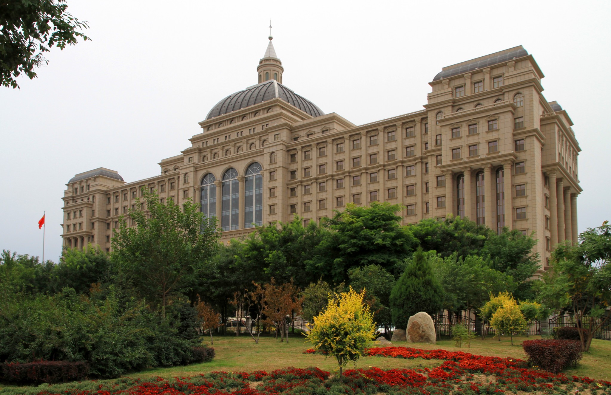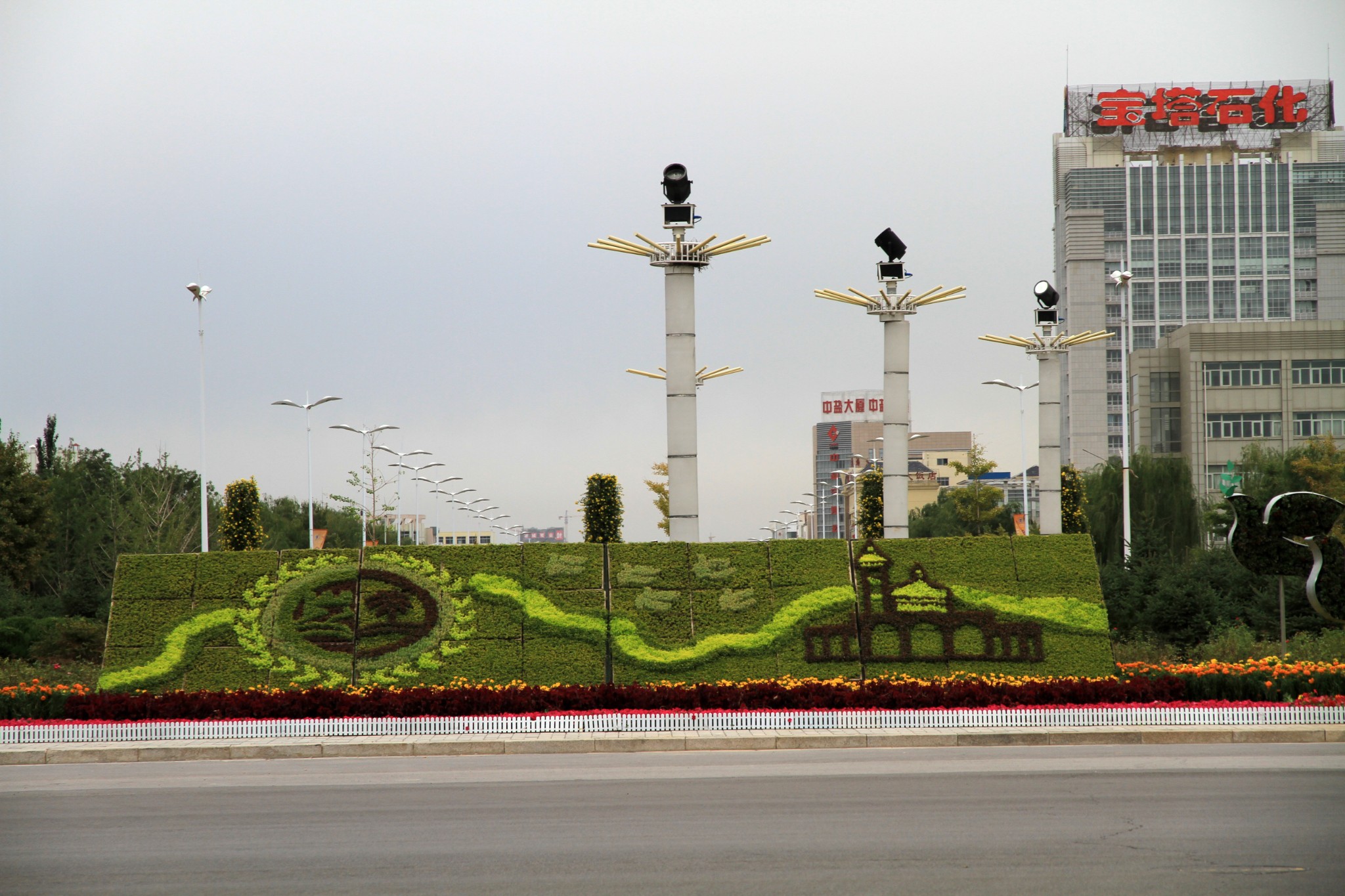 【银川凯宾斯基饭店】外景。临街的花坛与环岛路都属于楼对面的【市民广场】的一部分。