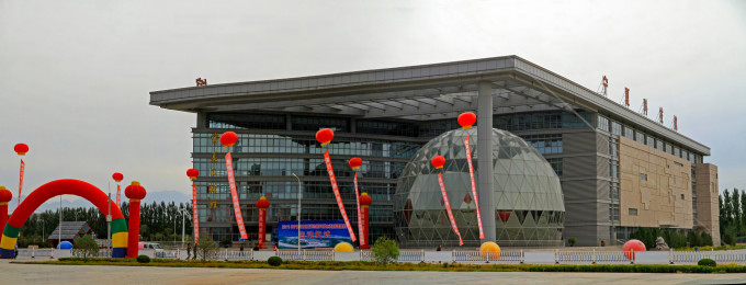 【宁夏科技馆】宁夏科技馆(宁夏青少年科技活动中心)同样是宁夏回族自治区成立50周年重点献礼项目。位于银川市人民广场西街,建筑面积近3万平方米,由主展馆、穹幕影院和综合楼三部分组成。科技馆外部造型极具吸引力,飘逸流动的玻璃顶壳,象征连绵起伏的贺兰山脉,丰富了周边建筑的天际线;穹幕影院所形成的玻璃球体和弧形展厅相对,象征着日月同辉;有机组合在主入口巨型构架之下。