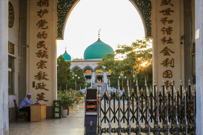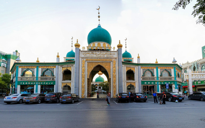 【银川南关清真大寺】据传原寺始建于明朝末叶,系一中国古典式建筑群。规模宏大,布局严整。礼拜大殿有前厦后室。殿堂门窗为红松木,雕刻工艺精美。南北厢房布置得体。中被拆毁。1981年8月重建。新建寺面积为2074平方米,分上下两层。礼拜大殿设于楼上,呈正方形,长宽各21米,宏伟壮丽。中部有绿色瓷砖饰面的4根方柱,殿顶为直径9.5米的巨型穹顶。穹顶底部与方柱之间为一段圆柱体的鼓座,上开24扇高窗,宽敞明亮,视野开阔。穹顶正中高悬月形灯,跨地面22米,高耸入云。下层为小礼拜殿、男女沐浴室、会客室、宿舍等。其间有回廊相连,自成一体。整个建筑典雅华美,庄重宏伟,呈现出典型的阿拉伯建筑特色。