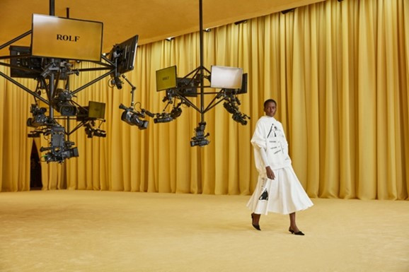此次快闪期间,巴黎老佛爷的每一个展示橱窗,都是PRADA 2021春夏女装秀场的再现。标志性的黄颜色幕布,内嵌淡黄透视框修饰。在每一个框内,PRADA 2021春夏女装秀场,正以黑白片的方式重现。