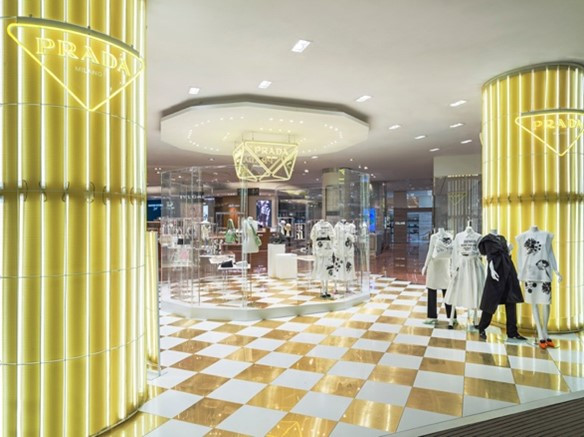 在整个快闪空间的中部,由带有PRADA logo的黄色霓虹吊灯和全透明围墙界定了本次快闪的精华区域。