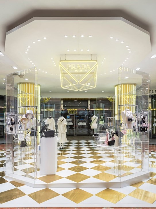 除了橱窗,PRADA也用快闪的方式呈现2021春夏新品。约80平米的全开放式快闪空间,被标志性的白、金围裹。双色棋盘格地板、霓虹灯柱,都是PRADA的标志元素。