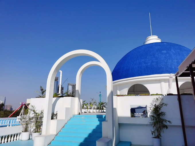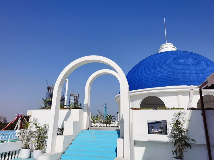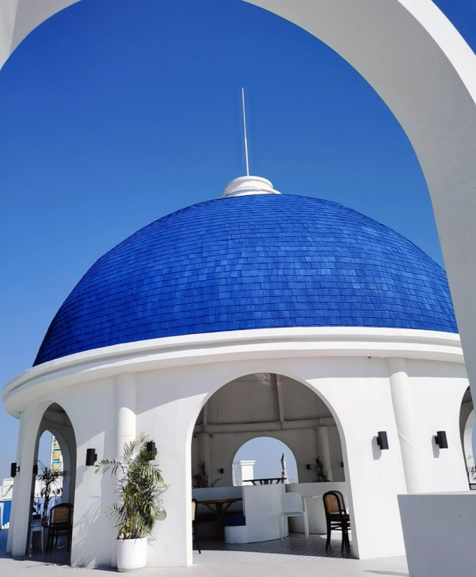 标志的蓝色圆顶白色小屋