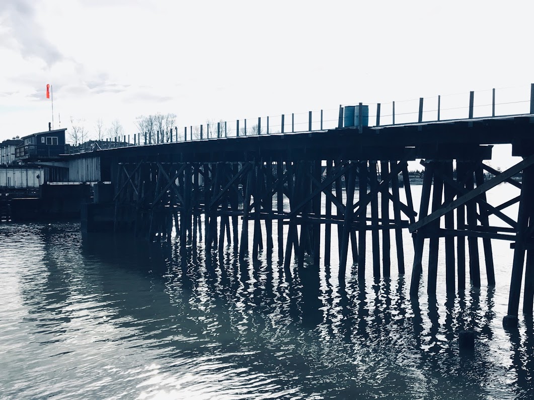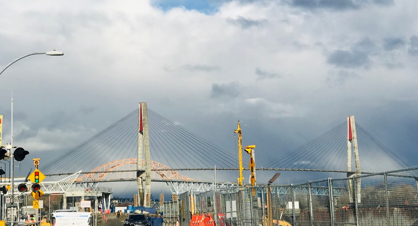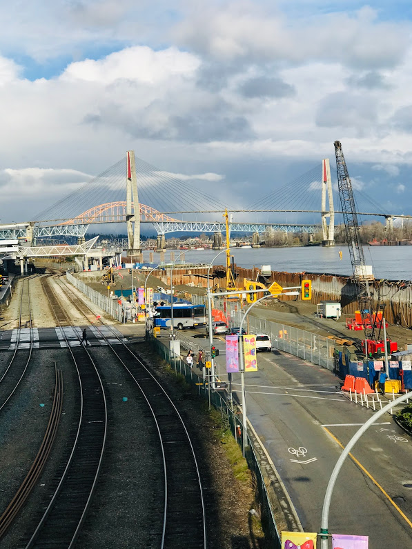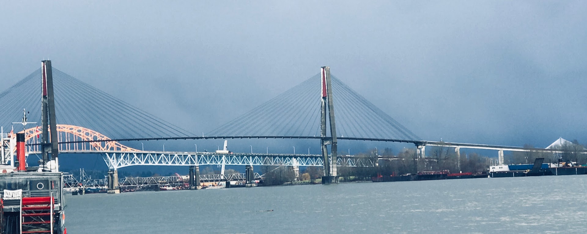 在码头上可以清晰的看到Pattullo Bridge(帕图洛桥),这是一座正在建设中的新桥,预计2023年通车,照片上后面的那座拱桥是老帕图洛桥,新桥建成后可能会被拆除。