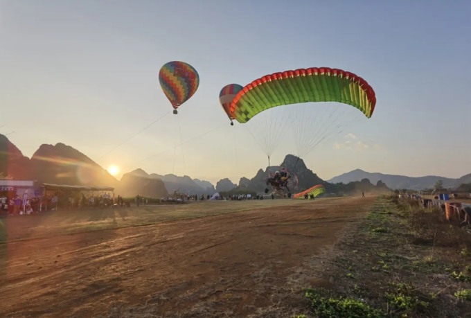 滑翔伞:坐上滑翔伞,观赏九龙·峰林小镇全景。