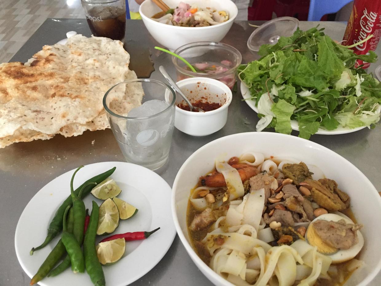 和朋友在越南,朋友喜欢吃海鲜,天天晚上吃,越南的海鲜价格至少比国内便宜一半以上。我更怀念的还是早上清淡的越南米粉,15000越南盾,哈哈,折合人民币也就5,6块钱,里面放了米粉、牛肉、薄荷、香菜、鸡蛋,味道很不错。辣椒和配料自己加,每当我看见我朋友大把大把的吃薄荷叶子、豆芽、生菜我感觉他像是在吃草一样,像一只羊。就是下面的米粉,那个脆饼也挺好吃。这么一大桌,20块不到吧。