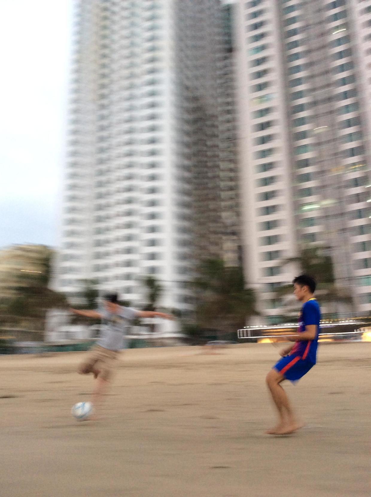在海边沙滩上,有一群越南小孩在踢足球,刚好我也喜欢踢足球,就和他们一起玩了。玩完了,就和朋友一起去海边拍照了。越南的海岸线可以说是亚洲最漂亮的海岸线了,延绵好几千公里,海岸线的南侧,就是南海了——我们中国富饶美丽的南海。
