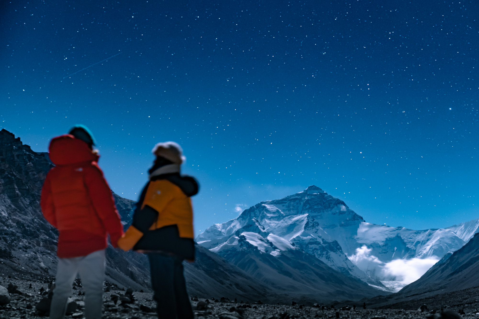 我脑中突然冒出这样一个比喻:如果天地是一个容器,那么珠峰就是一朵莹白色的小花,在漫长的岁月里,在无数次日升月落中,孤傲而安静的绽放着。