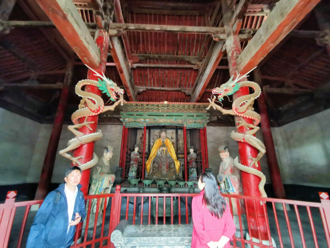 晋祠“三宝”是连在一起的,位于晋祠的中轴线上,可一并游览。献殿是供奉祭祀品的场所,四面的墙壁是栅栏状的,通风凉爽。最为特别的是,整个殿内的梁柱上没有用一颗铁钉。鱼沼飞梁位于献殿前,建于宋代。整个景观造型类似现代的立交桥,是国内现存古桥梁中仅有的一例。“飞梁”的一端连接着圣母殿,圣母殿是晋祠现存最早的主体建筑。大殿内很宽阔,有梁无柱是一大看点,殿前8个廊柱上雕刻着8条跃跃欲飞的木雕盘龙,连同“鱼沼飞梁”显得颇有气势。