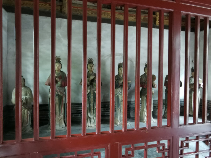 以圣母殿为中心,很容易找到“三绝”。彩绘泥塑人像就在圣母殿里,主像圣母端坐在木制神龛内,端庄华丽,其余42尊侍从分列两侧。这些塑像衣着艳丽,表情各异,其中有一尊花旦装扮的侍女,半面欢喜半面忧愁,让人看后心情也不禁五味杂陈。梅兰芳大师曾在这尊侍女前伫立良久,仔细品味她的动作和内心,并且大加赞赏。周柏位于圣母殿北侧,植于西周,已有3000多年历史。难老泉位于圣母殿南侧,晋水的源头就从这里流出,长年不息。