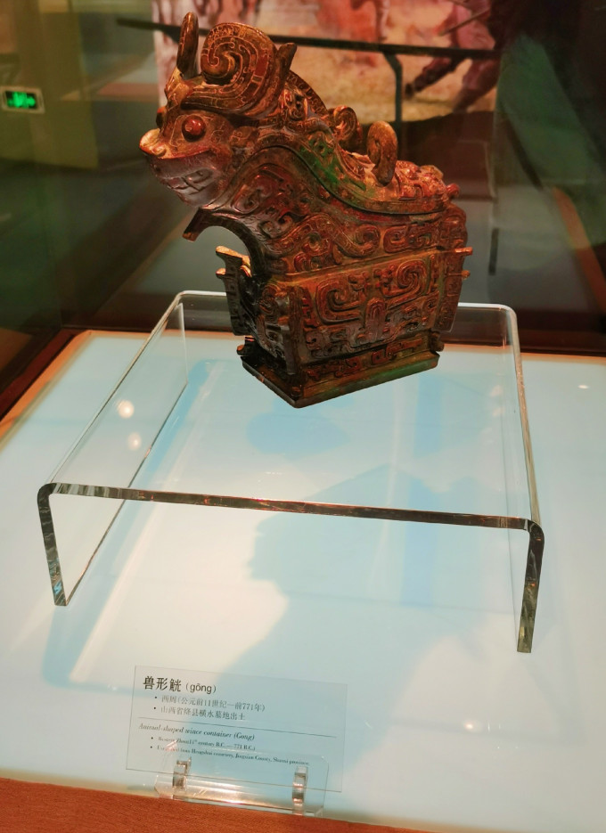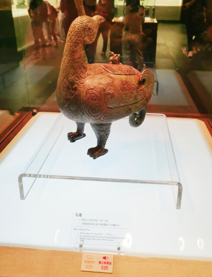 鸟尊,西周时期的青铜器,晋侯宗庙祭祀的礼器。鸟尊的造型极为精巧,以凤鸟为主体造型,在凤鸟的腹背上有一只小鸟,用作鸟尊器盖上的捉手。凤鸟的尾部,有一只大象,长长的鼻子恰到好处地与凤鸟的双足形成三足鼎立之势,保证了鸟尊的稳定性。这件藏品是院内所藏青铜器的代表作。