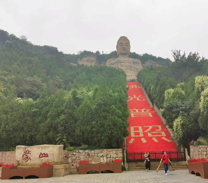 蒙山大佛,仅次于乐山大佛世界第二大佛。开化寺后摩崖佛像。唐高祖李渊、高宗李治与武则天、后唐武帝李克用、后汉高祖刘知远都曾来此礼佛。来时遇不良滴滴司机,说这就是一破厂挖出佛身改建的遍地黄沙啥都没有,强烈和我推荐另一景点,没理他,却是一派山清水秀。