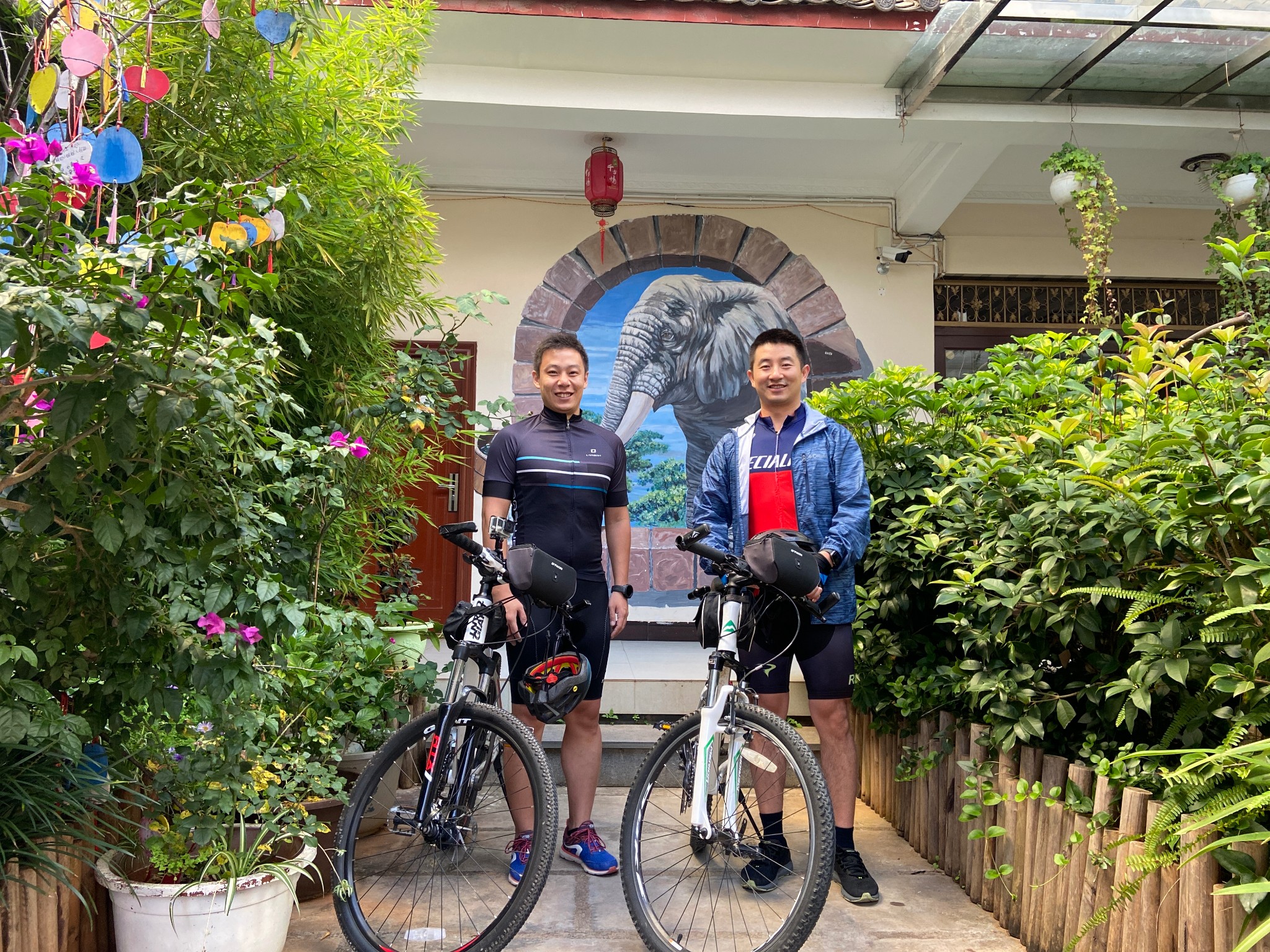 早上出发,按照惯例拍个合影,奈何稍微有点早,没找到人拍,又不好意思把民宿老板叫起来,找各种地方把手机支起来都不太成功...后来终于看到隔壁民宿有人要出发,这才帮忙拍了,一个疫情下来,胖的无法直视了...