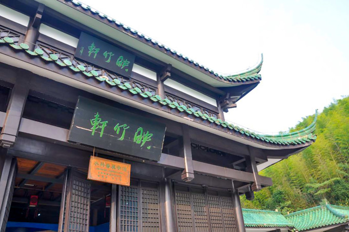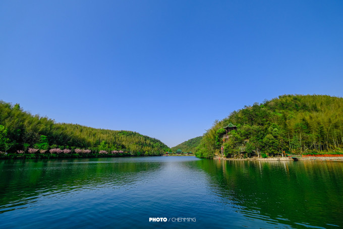 映竹轩的后面由山涧水和天然雨水汇集成的“镜湖”,湖水终年清冽如一的明镜。放眼望去,竹在水中长,水在竹间流,镜湖与绵延的竹海相映成趣。镜湖内还生长有堪称“水中大熊猫的”珍稀生物——“桃花水母”,据说每年8~11月都可观赏到,镜湖一角的“水母亭”是观桃花水母的最佳处。