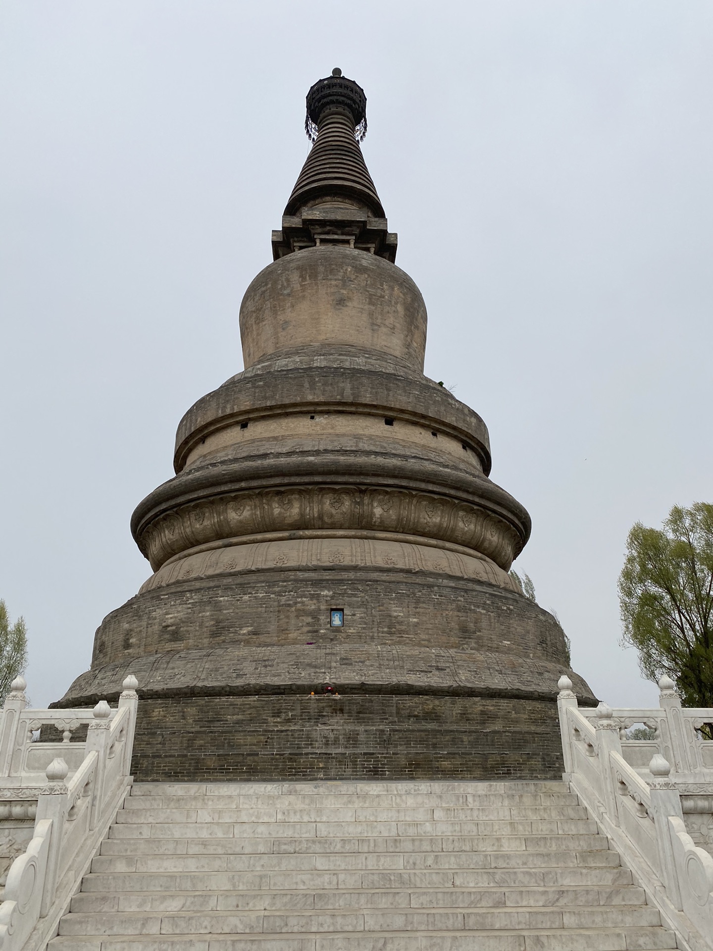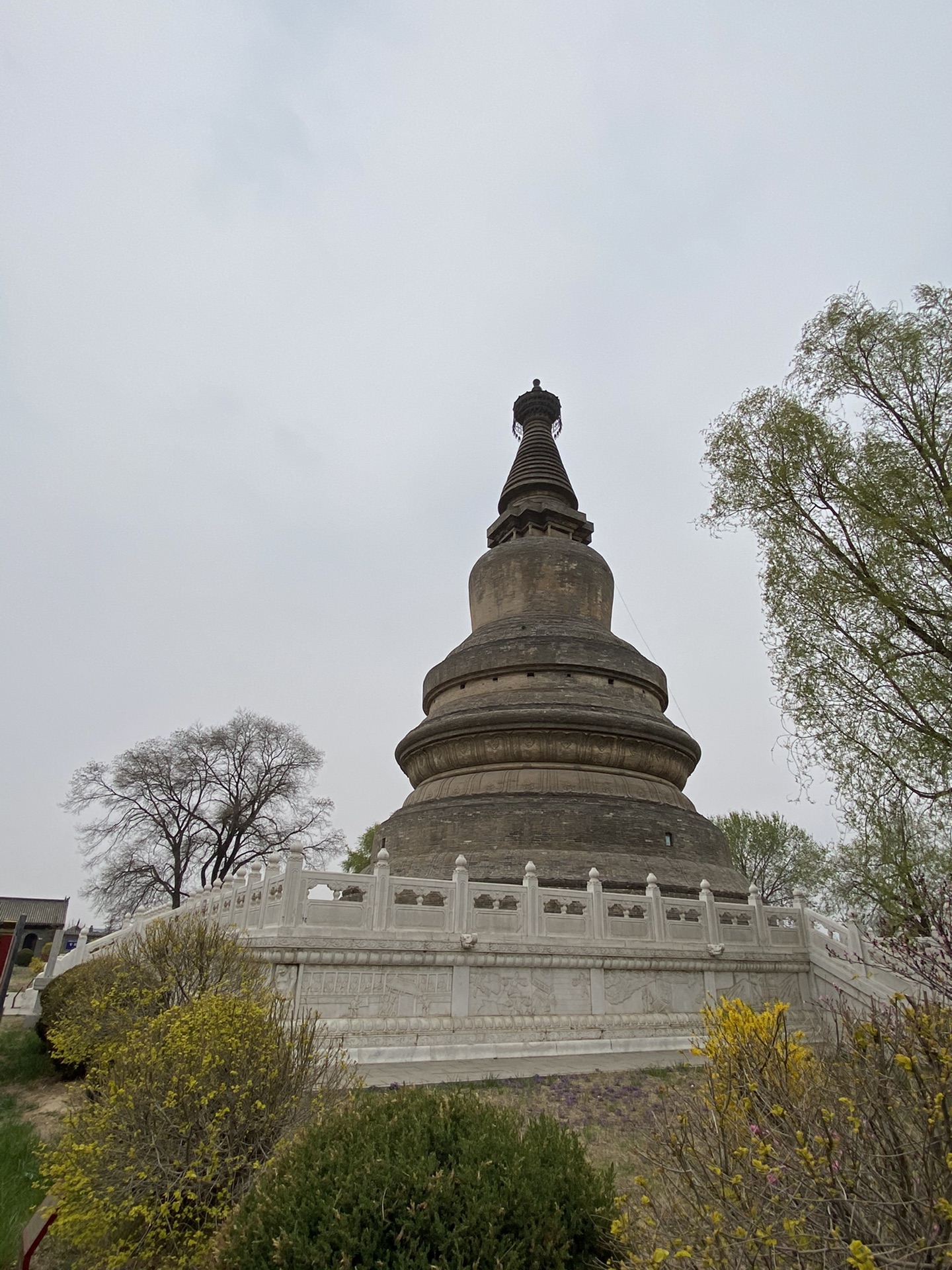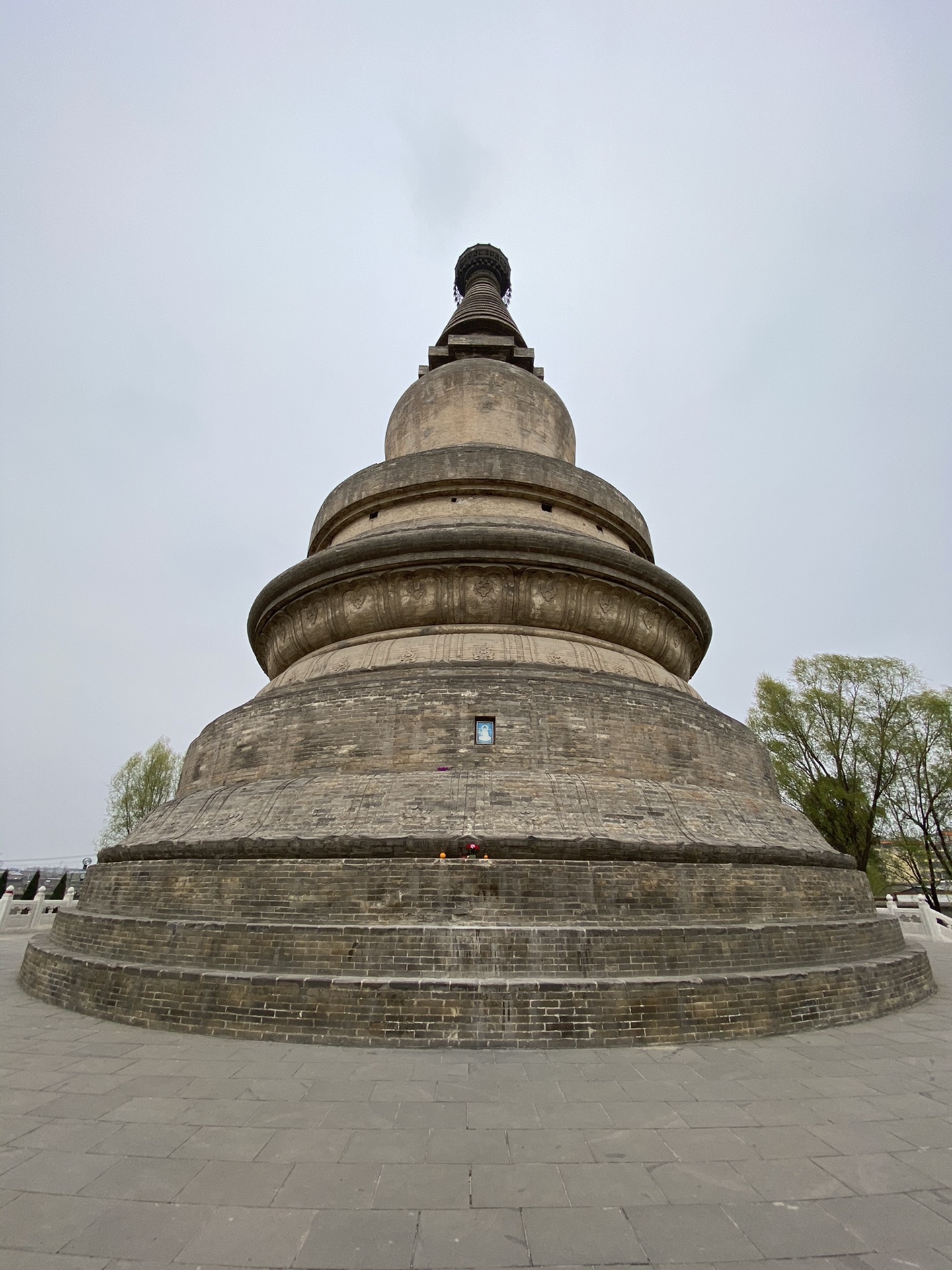 此塔最早建于隋代,为木结构塔,到了元代又进行了重建,改建成了砖塔,明代进行了大修,形致为藏式覆钵式塔,圆形,塔高40米,塔座平面圆周长60米,分为塔基丶塔座丶塔身丶塔刹四部分,整体呈圆锥形,形象古朴丶比例均匀丶雕刻精美丶体量巨大,是十分珍贵的古代历史文化遗迹,2001年7月16日被列入全国重点文物保护单位名目。