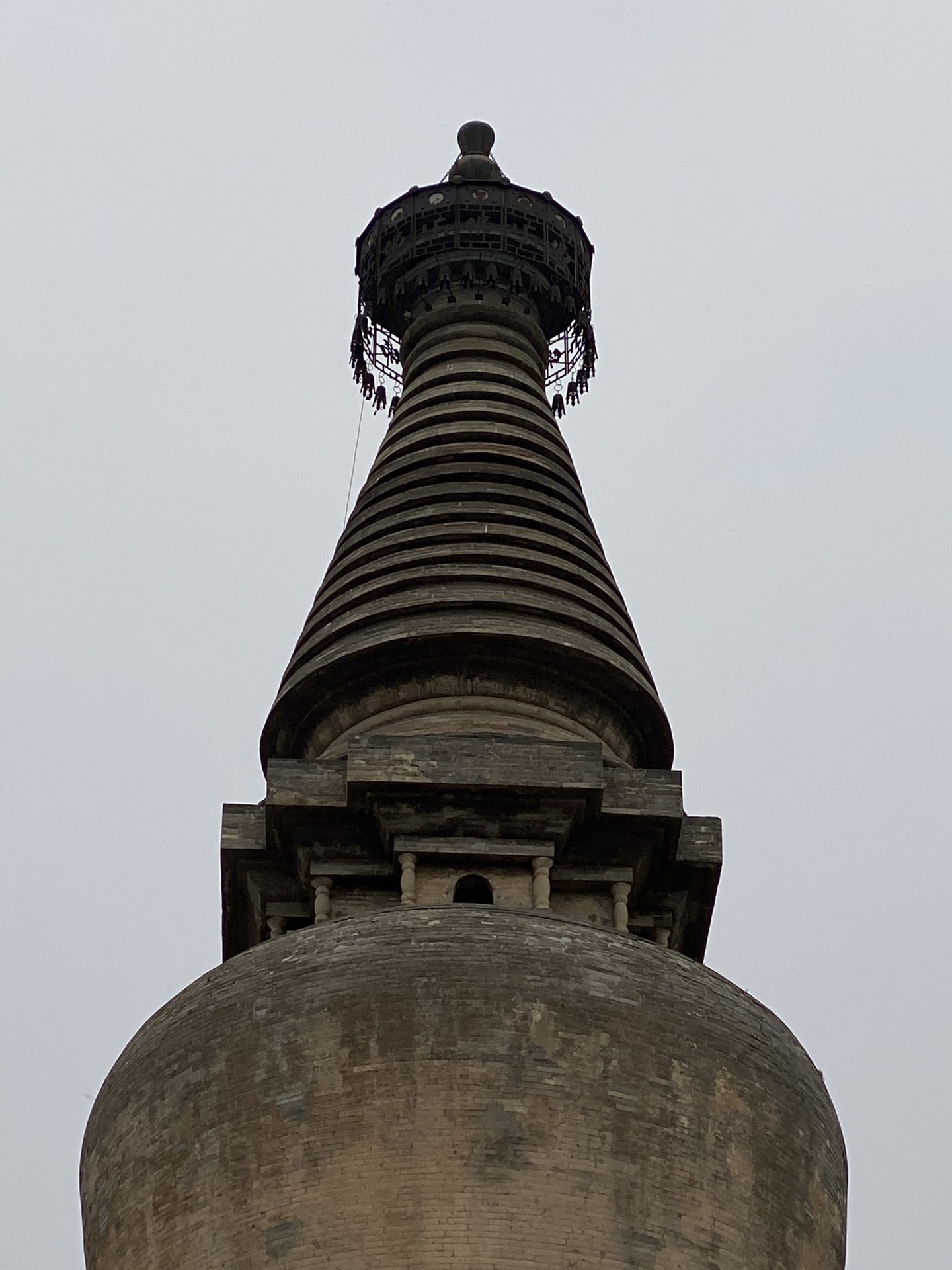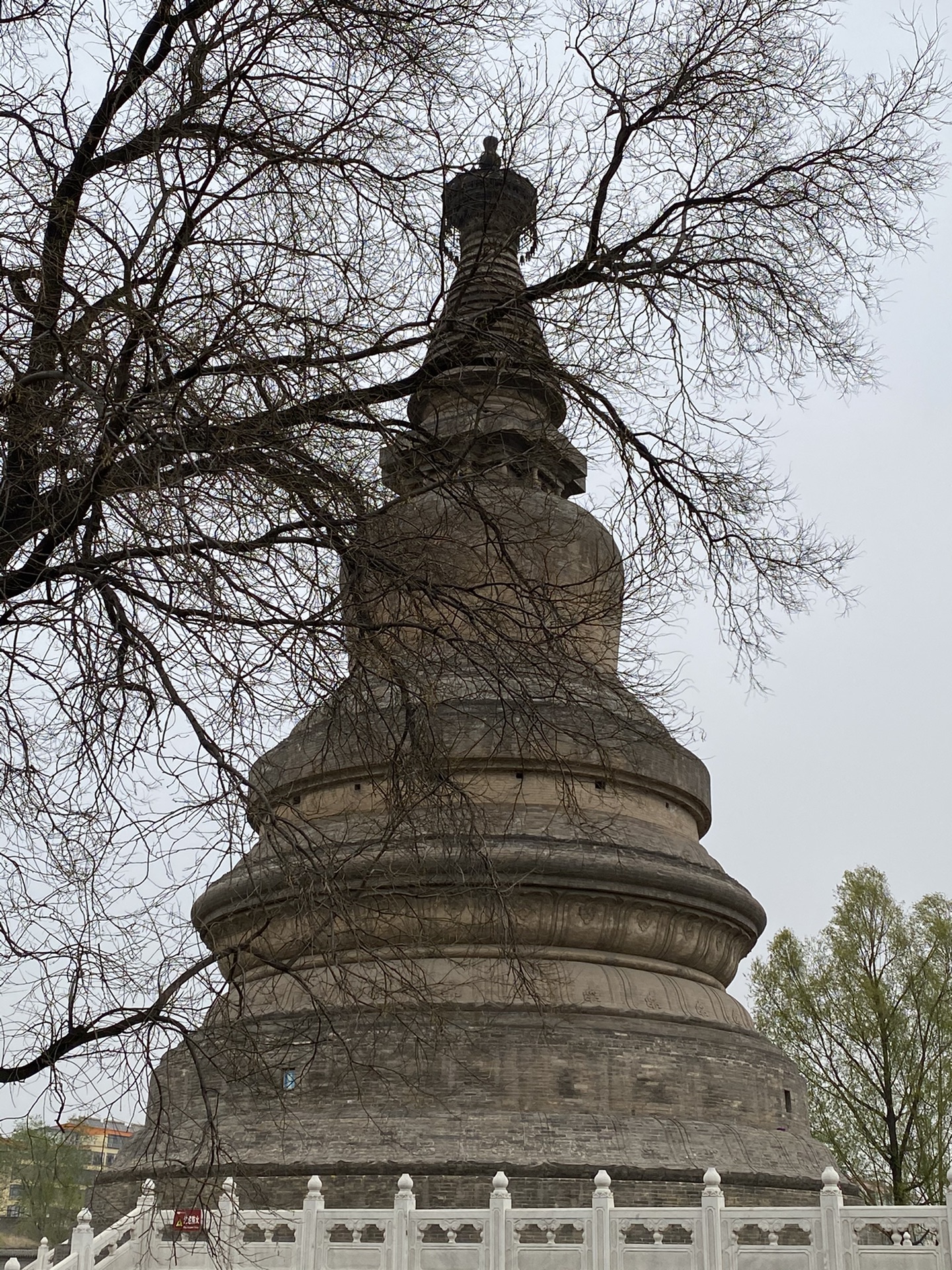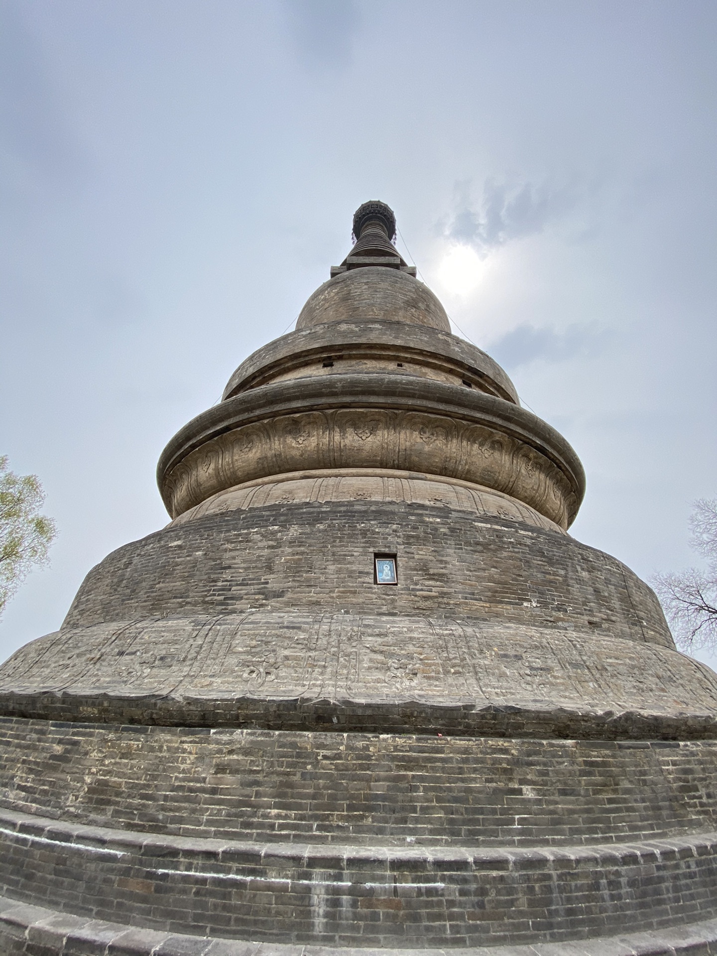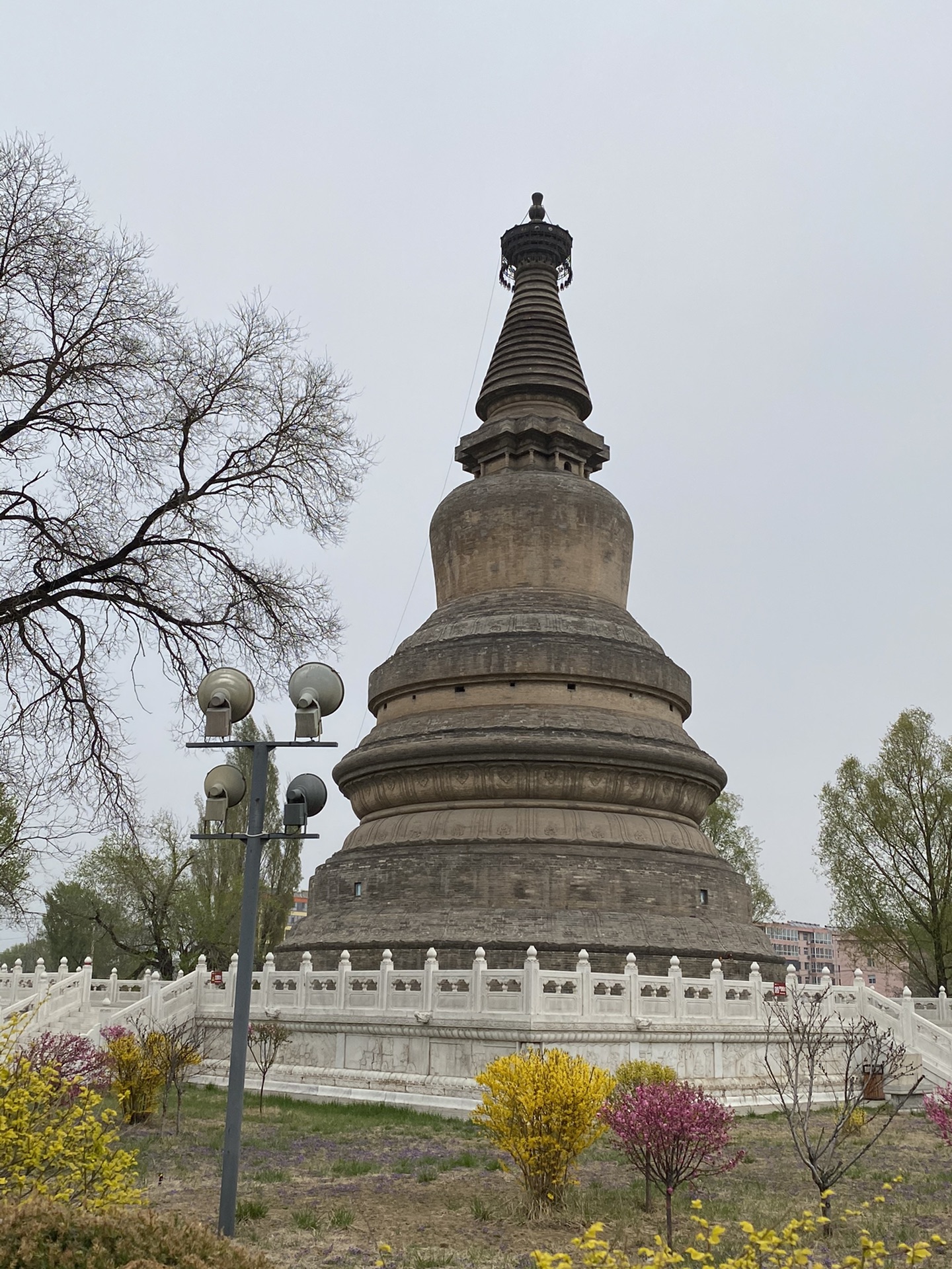 此塔最早建于隋代,为木结构塔,到了元代又进行了重建,改建成了砖塔,明代进行了大修,形致为藏式覆钵式塔,圆形,塔高40米,塔座平面圆周长60米,分为塔基丶塔座丶塔身丶塔刹四部分,整体呈圆锥形,形象古朴丶比例均匀丶雕刻精美丶体量巨大,是十分珍贵的古代历史文化遗迹,2001年7月16日被列入全国重点文物保护单位名目。