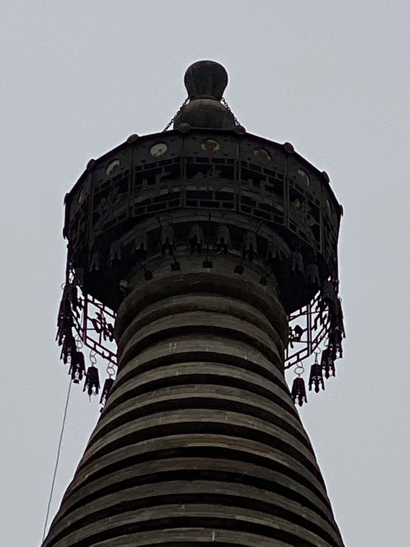 塔刹建在约1米5高的曲尺型须弥座上,上边为逐层内收的高约10余米的13层相轮,相轮上边是葫芦状宝顶,宝顶四周装有三层盘盖式金铎,盘盖四周挂满风铃,随风飘动,悦耳动听。