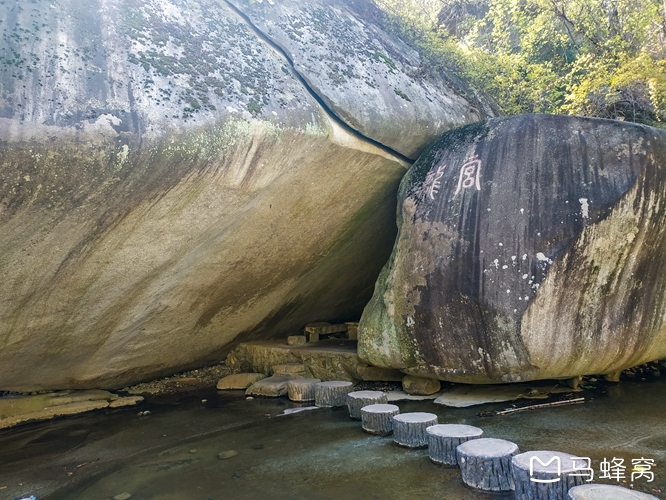 九龙圣母潭和青龙潭的西侧,碧水环绕的巨石下显现一眼深邃的洞穴,巨大的"龙宫”二字跃然石壁。神秘的“龙宫”,是由巨大的花岗石快,在6500万年来的抬升过程中,崩踢于谷底棚架而成。