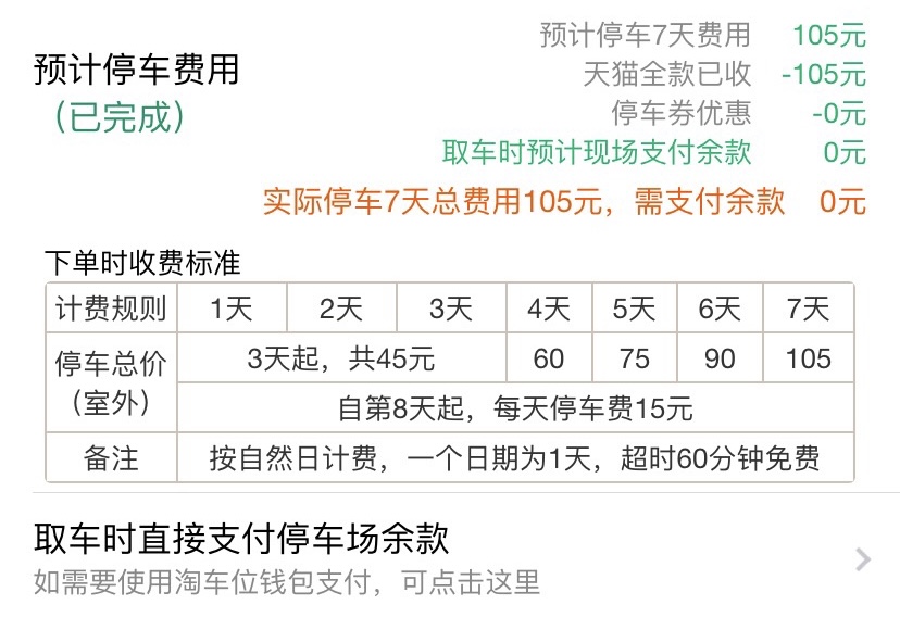 因为要比较早出去,所以只能过去机场附近住一晚, 我们是选择自驾去机场,跟往常一样,我们选择了机场周边的停车场,大家可以去某宝找,很方便 我停了6天才105,因为我最后一天是超过一点走,所以是算一天,如果1点前走的话就可以少算一天的,还可以接送机,