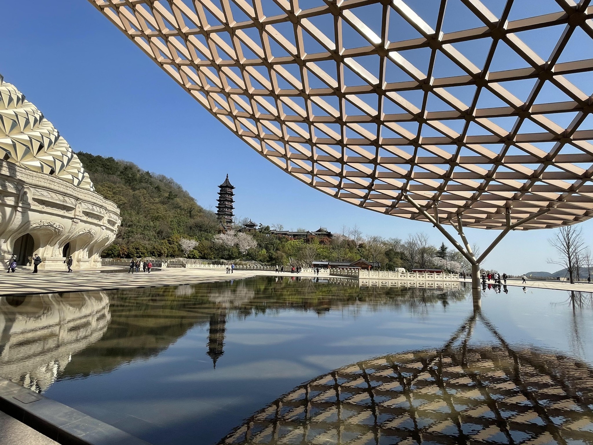 禅境大观,南北长112米,东西宽62米,内部净高约41.2米,涵盖了地上三层。整个空间面积超过6000㎡,呈椭圆形,以黄、白、灰三色为基调,布置出人间山水,从而让人们在行走之际领略禅意。由佛陀出生、成道的禅境花园及中间的如莲剧场三个部分组成,展现了佛祖一生的行迹。