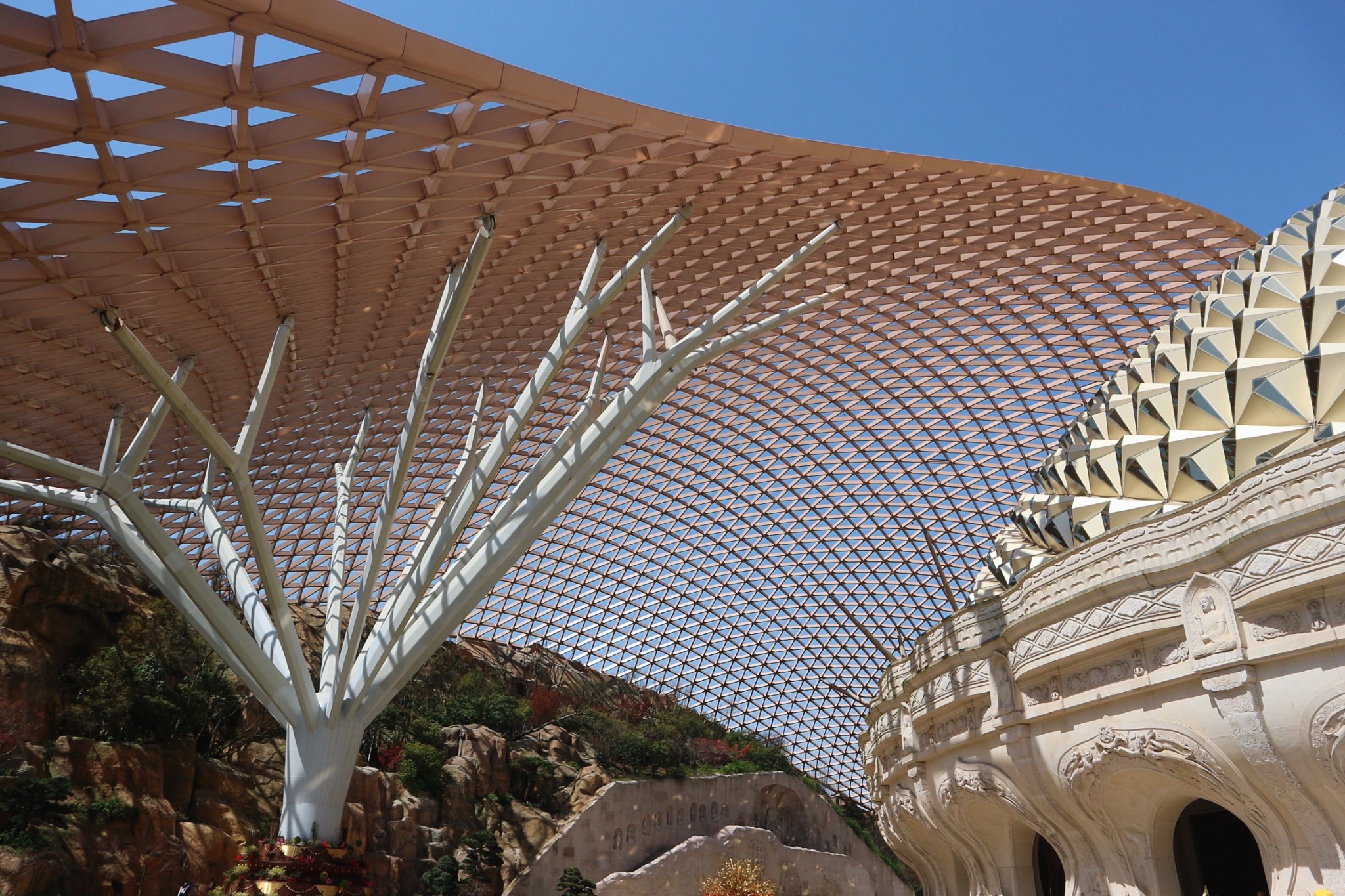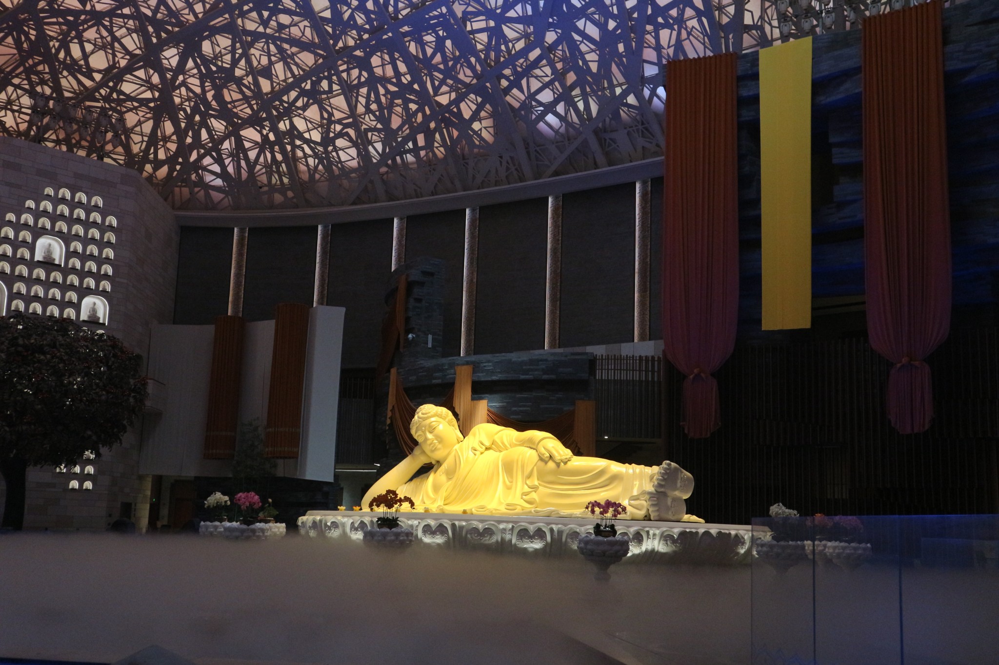 禅境大观的顶部是娑罗穹顶,图案来源于佛陀涅盘时的娑罗树杈。穹顶采用了全覆盖的透光膜和灯光,可以营造出清晨的第一缕晨曦、正午热烈的日光、傍晚的彩霞和入夜的月光。中心为全铜铸造的释迦牟尼卧像,全长7.5米,表面仿以汉白玉材质,能360度缓慢地旋转,表现了佛祖宁静、安详的涅盘境界。