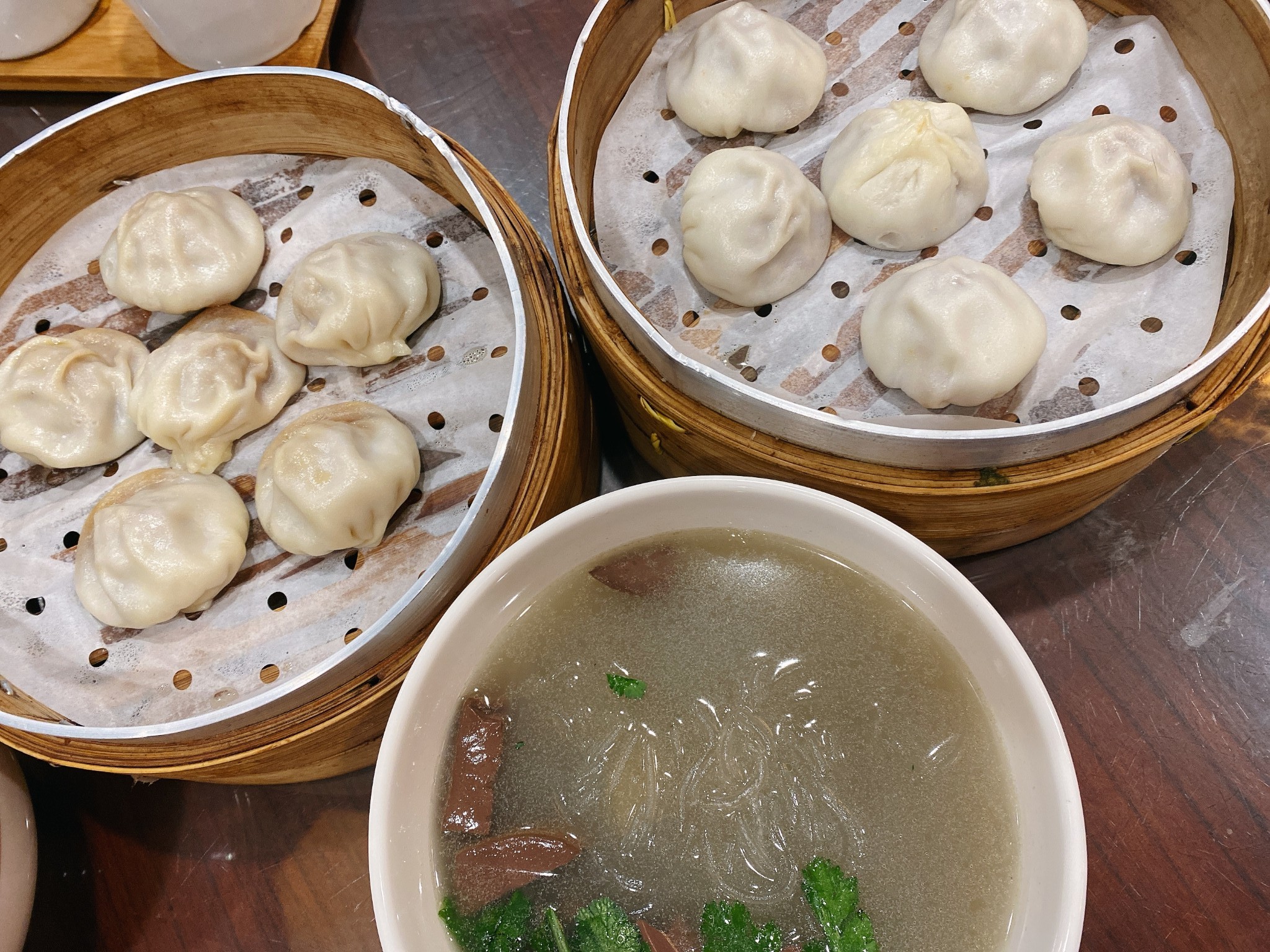我们点了两笼灌汤包一碗鸭血粉丝,那个灌汤包皮很薄,一口下去满满的肉汁,一个字,正