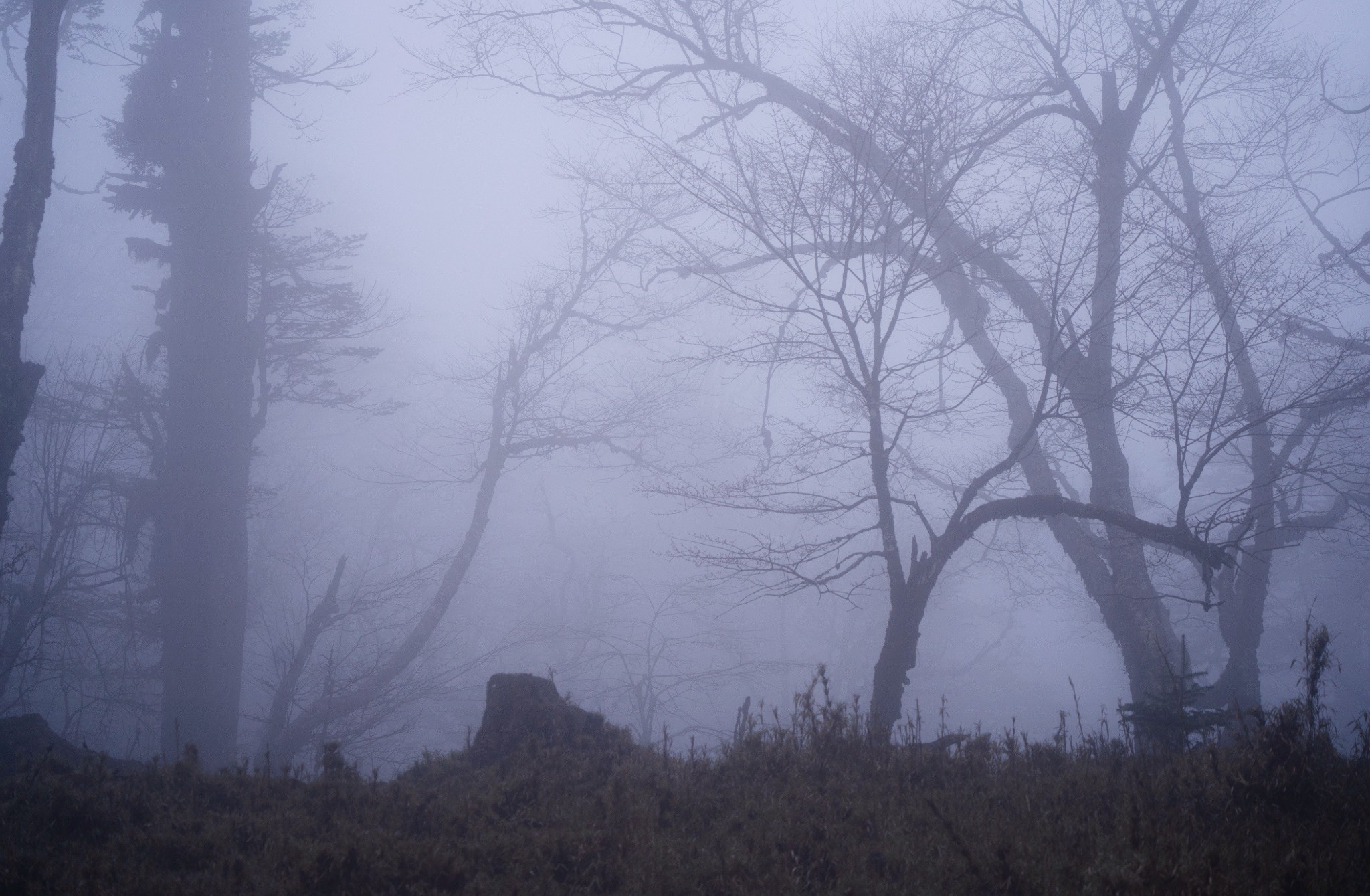 树林里的树干姿态万千,有的像壮士,有的像恶魔,在晨雾的笼罩下更增添了几分神秘色彩。