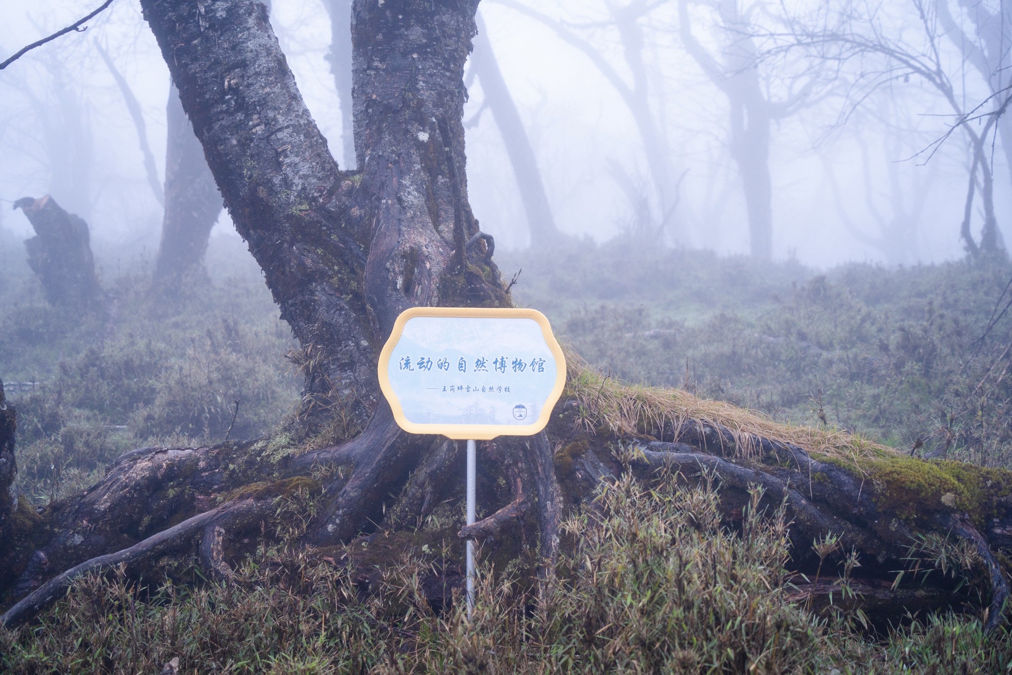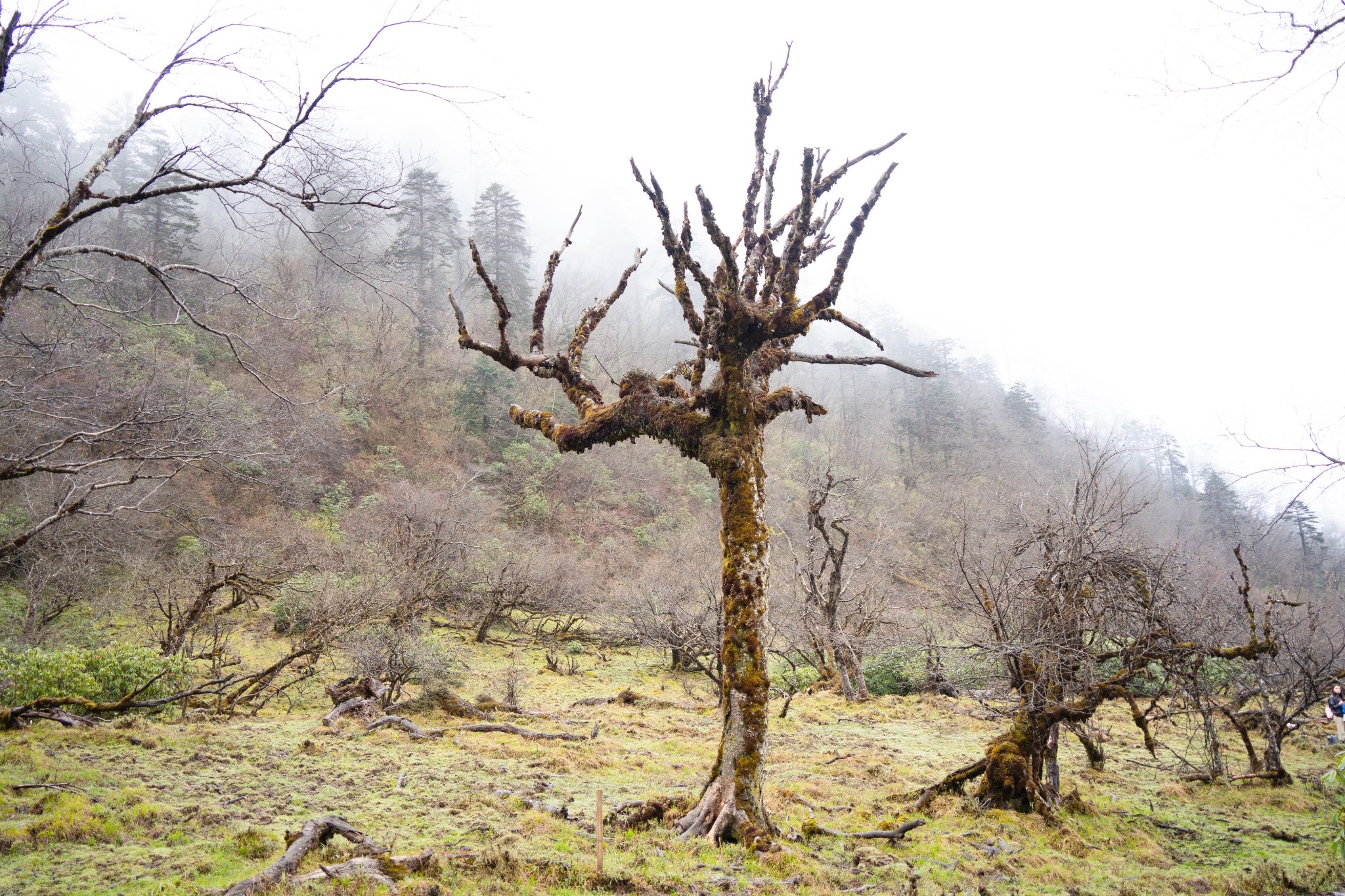 观光车行驶在山间,因为天气原因雪山被云雾深深包围着,不肯露出神秘面容,于是我们准备先去怪树林看看。