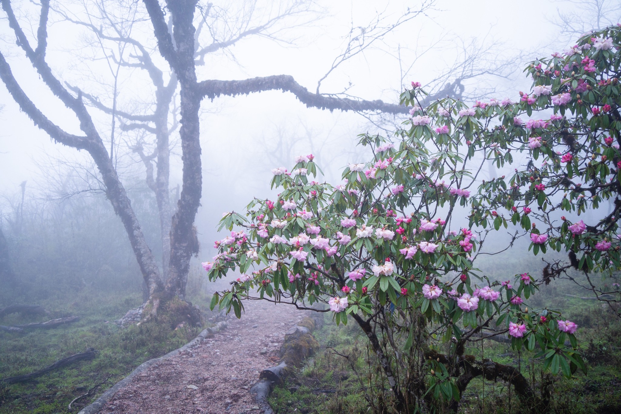 这种高山杜鹃的花期在每年的5-6月份,很喜欢这种粉粉的杜鹃花,它让这个怪树林里多了一丝浪漫气息。