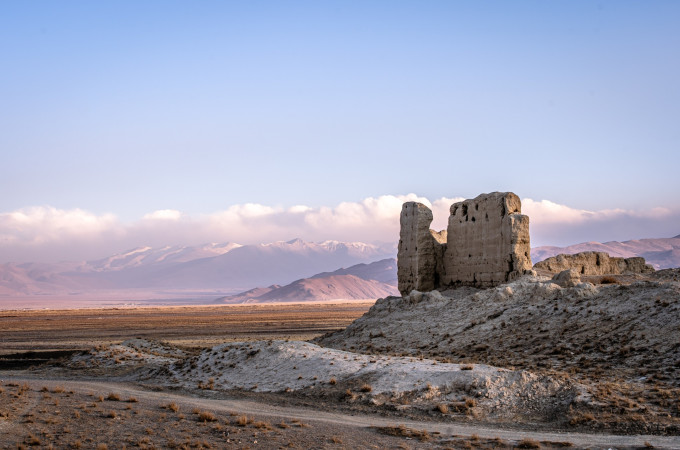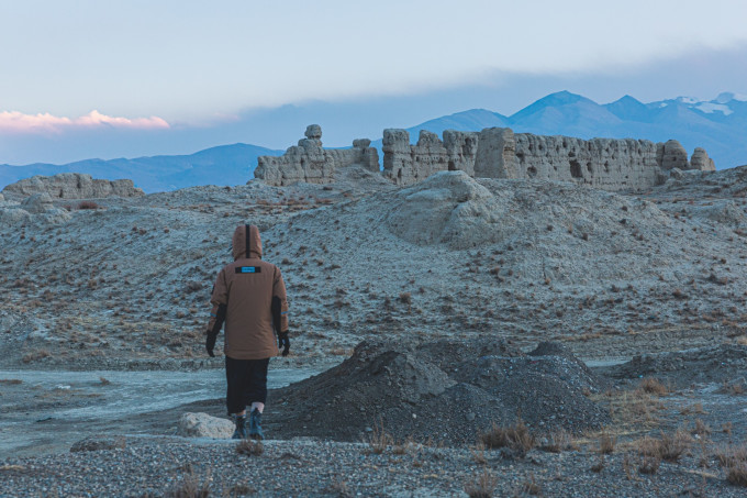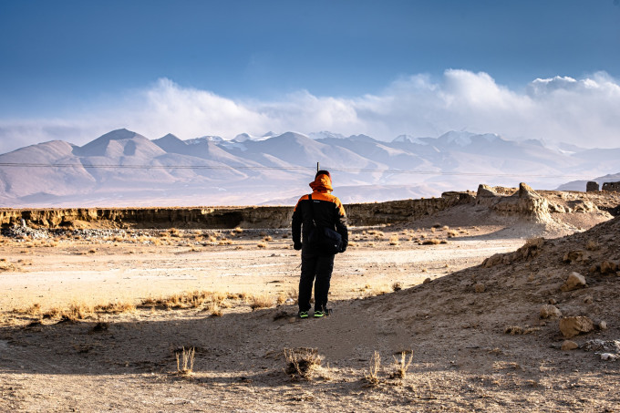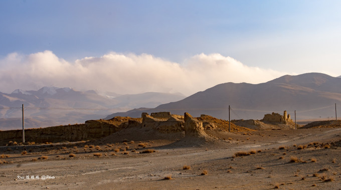 找了一小矮坡,居高放眼望去,天幕下银峰雪色在云层中若隐若现,朦胧中天际里静卧着一条银雕玉塑的飞龙,透过飞檐的翘脚中看到了雪山的影子。前方的无名残迹在经历岁月风霜的洗礼后依旧挣扎站立,在夕阳的照射下折射出一股淡然,给人一种雄浑巍峨,冷峻圣洁的美感。“古堡”残留遗迹千姿百态,断壁残垠中颇有大西北俄博梁“魔鬼城”的风姿,目测绝对是岗嘎村附近拍摄星空银河的最佳地。然而我们并未有这个时间。