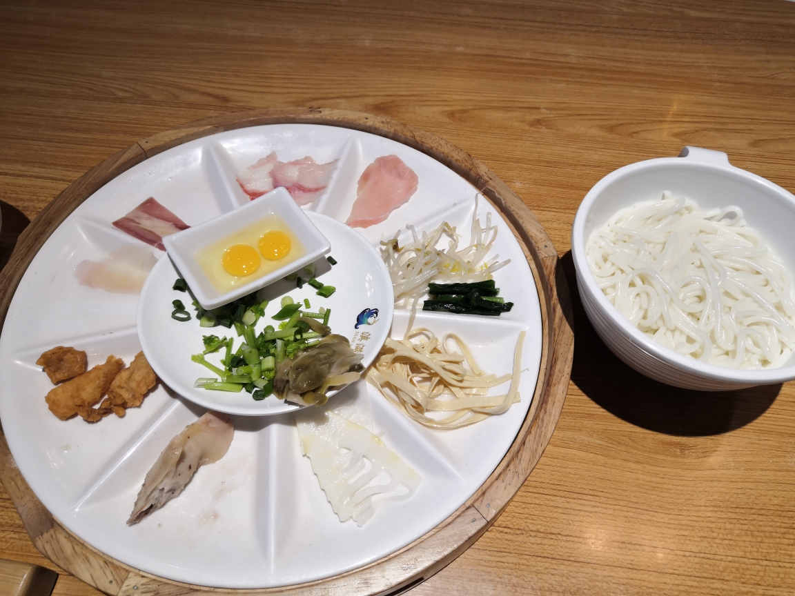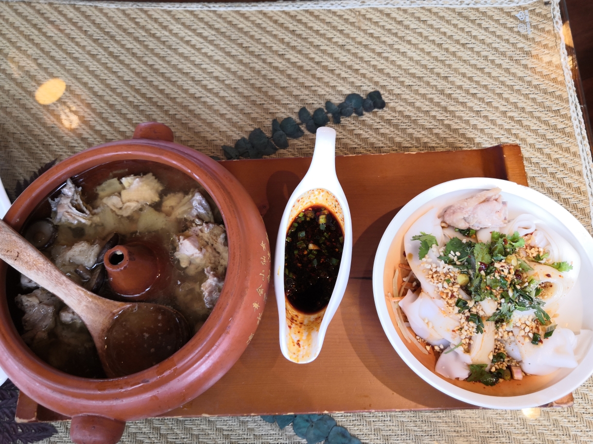 逛完后差不多到吃饭的点了,于是在商业区里面找吃的,发现人都非常多,找了几家,排队都要半个小时以上,然后在美团上找了一家过桥米线店,在路边,于是去看看,发现人不多,还不用排队,于是就在这里尝一下正宗的云南过桥米线,点了2份,一份38的一份68的,区别在于配菜的多少,价格不算便宜,面可以免费加,味道还不错。