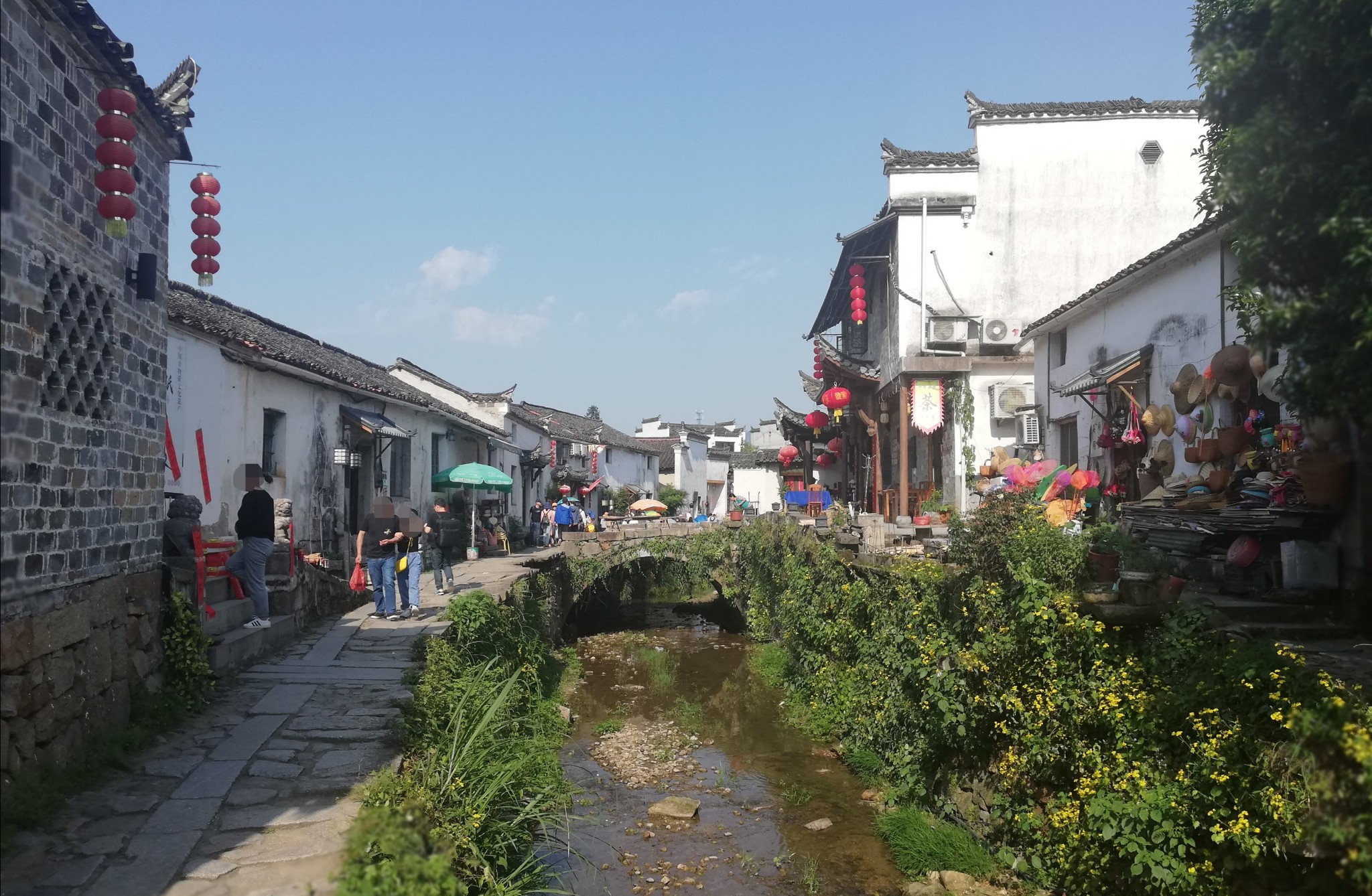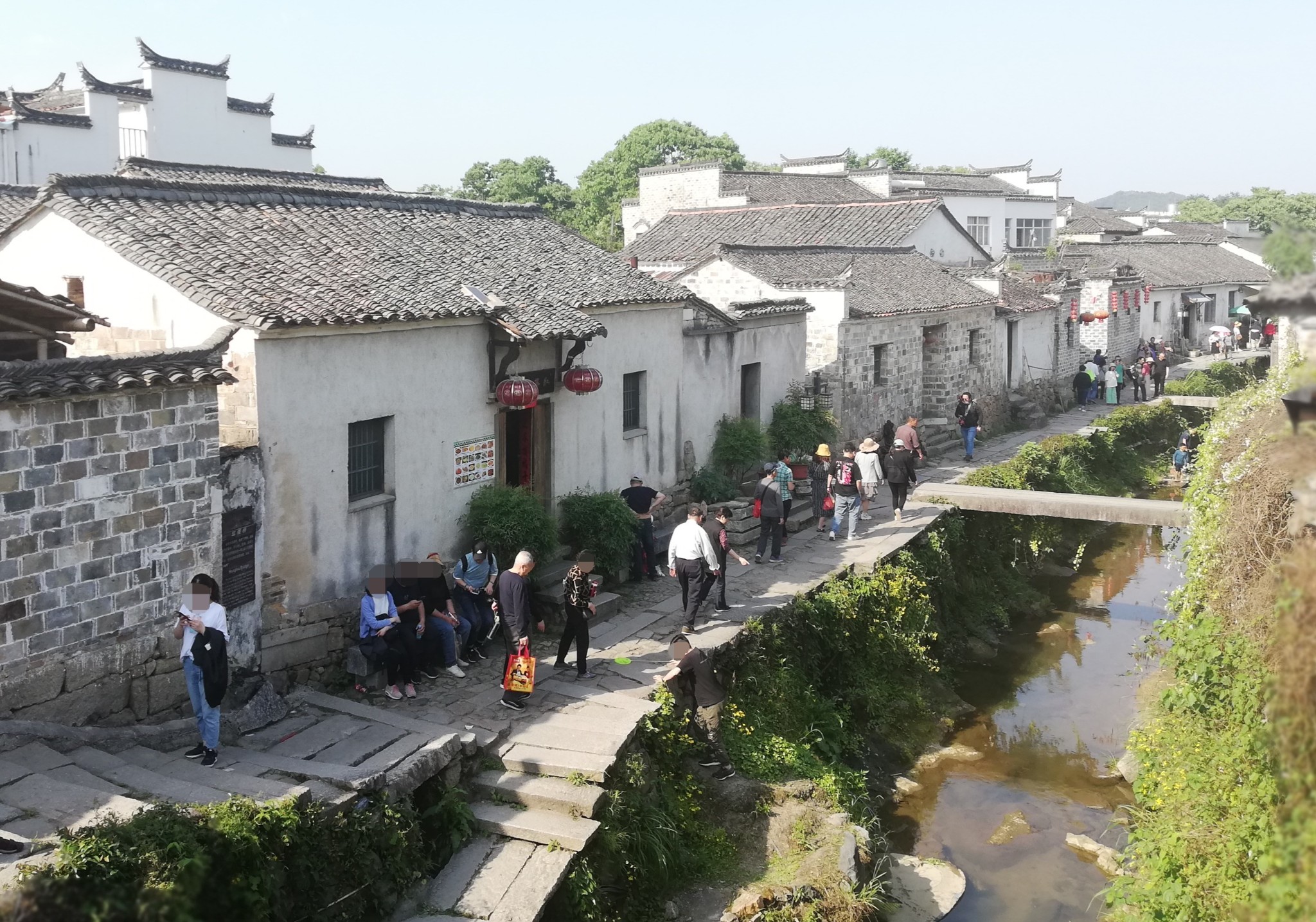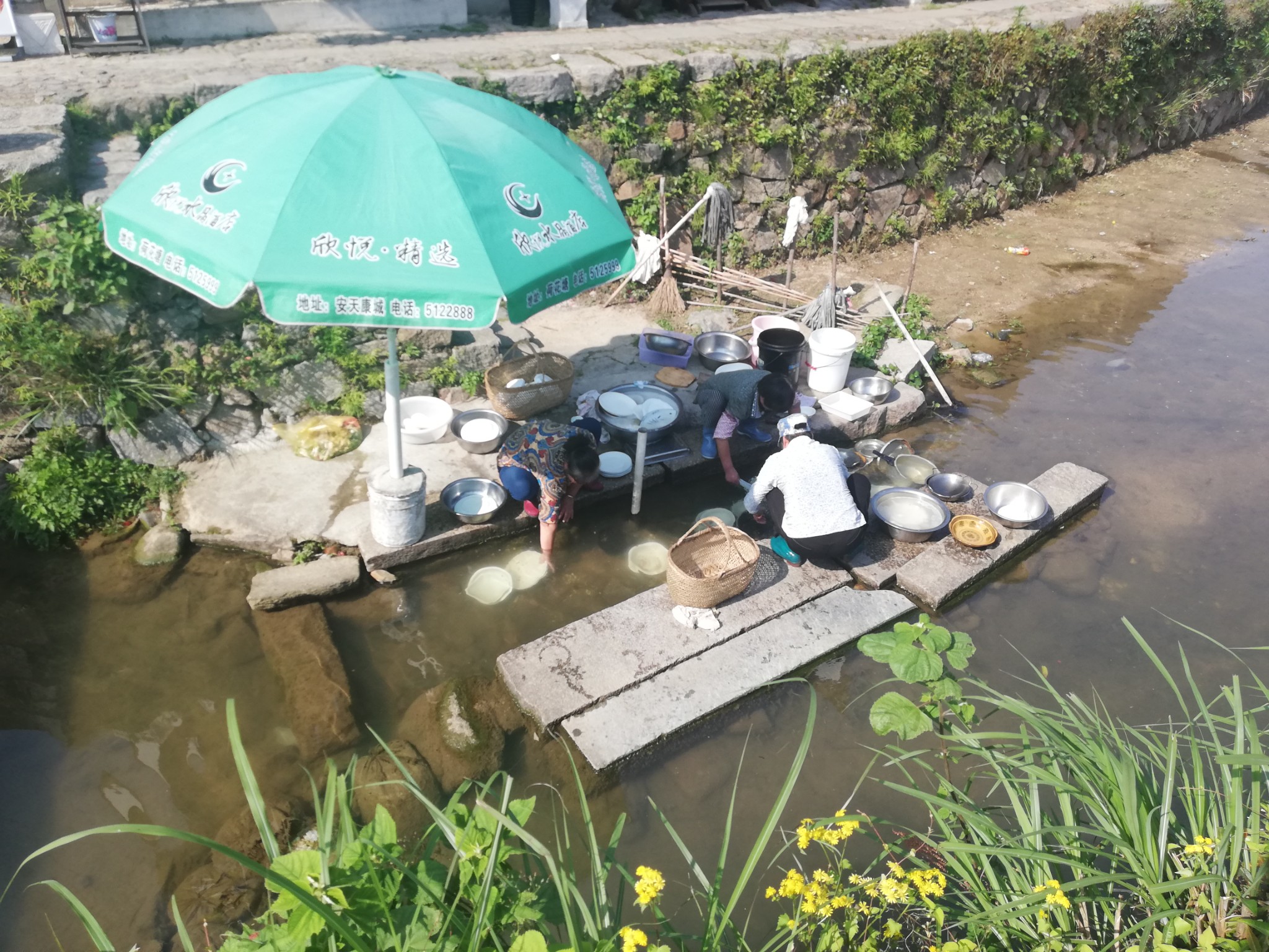 买好门票,景区提供免费的公交车送到入口,入口位于查济美术馆处。一进景区,就瞧见许多小餐馆的人在河道内洗碗,洗洁精和油污随意流淌。