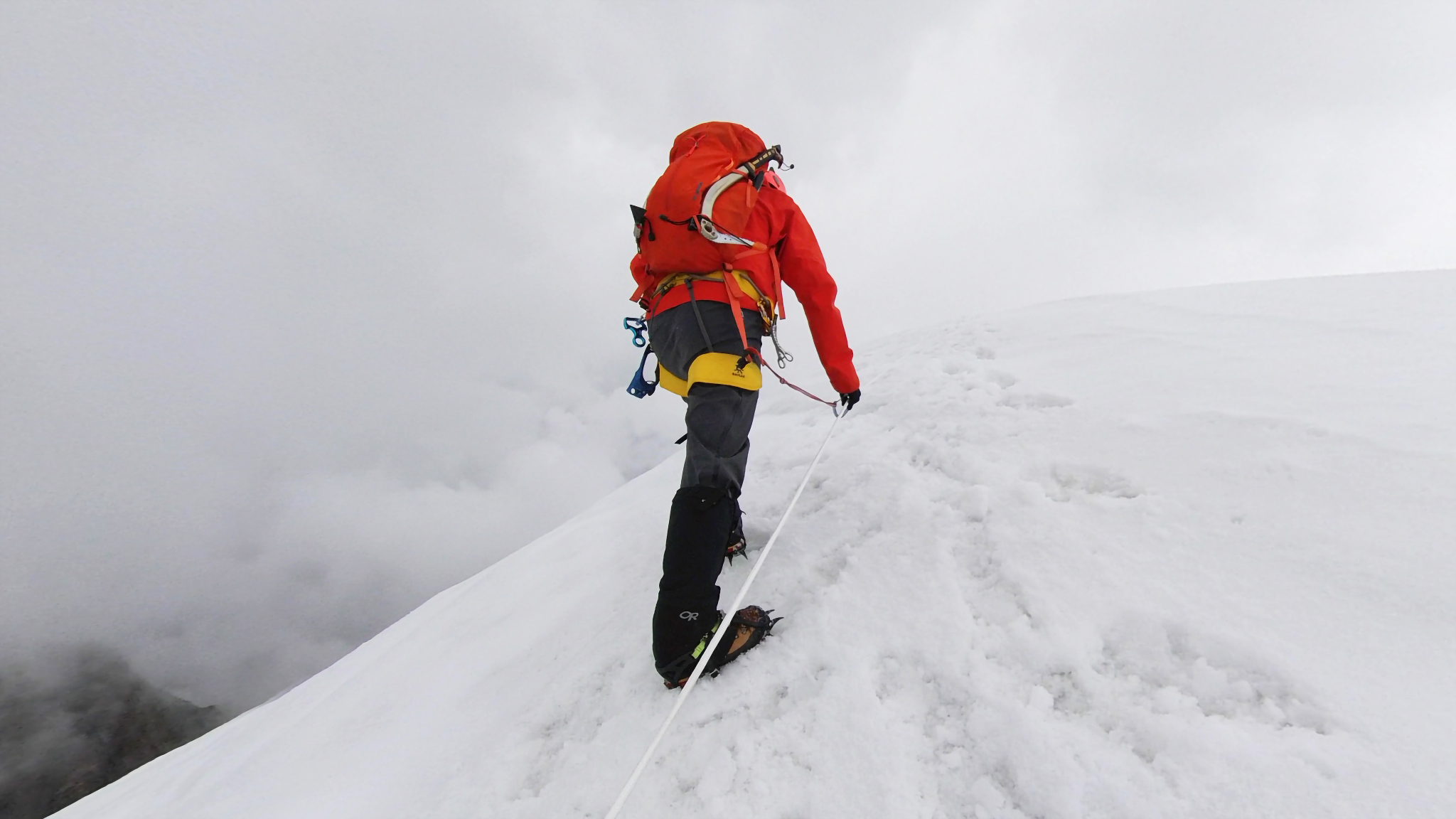 雪宝顶是一座冰岩混合的山,需要带冰锥、岩钉,和很多快挂, 协作这时候穿的是军胶,但上去都要换成高山靴。再建好保护站放下绳子之前, 需要一个先锋攀,拿冰镐在没有保护的情况下到达顶端。