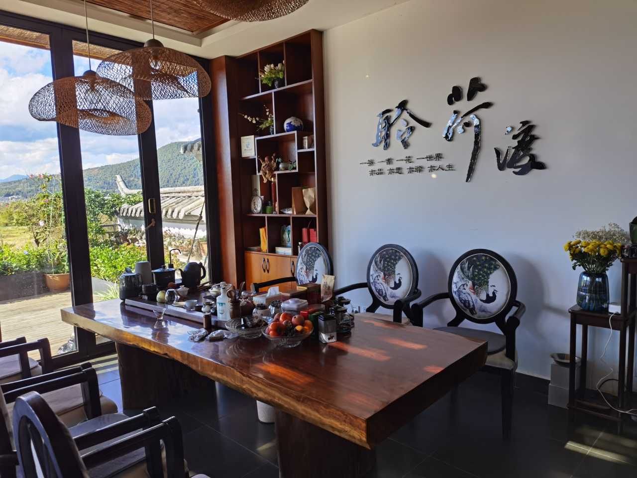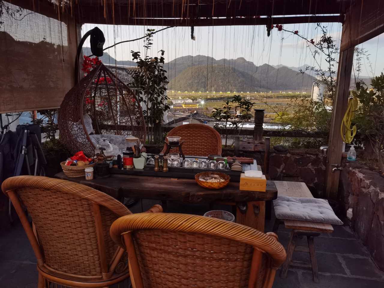 到民宿办好入住手续,上到这个小平台,只见桌上摆满了各式各样的茶具茶叶,抬头眺望远处有青悠悠的山峰连绵,近处有黄色的稻田。美啊!