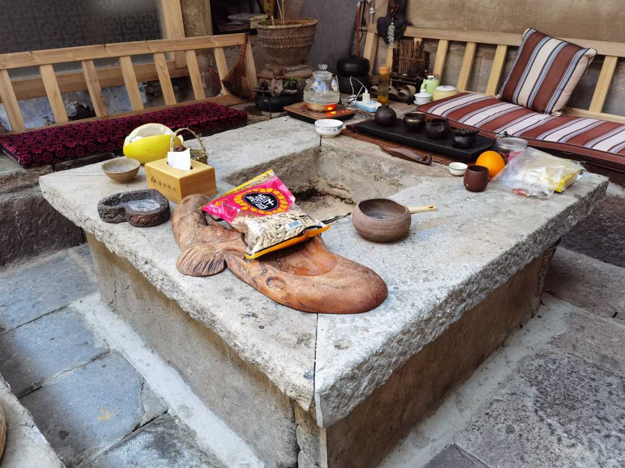 天黑之后气温下降,老板、老板娘、还有些客人,会在院子里围坐烤火取暖,吃零食聊天。一只可爱猫猫,在一旁眯着眼睛打盹。