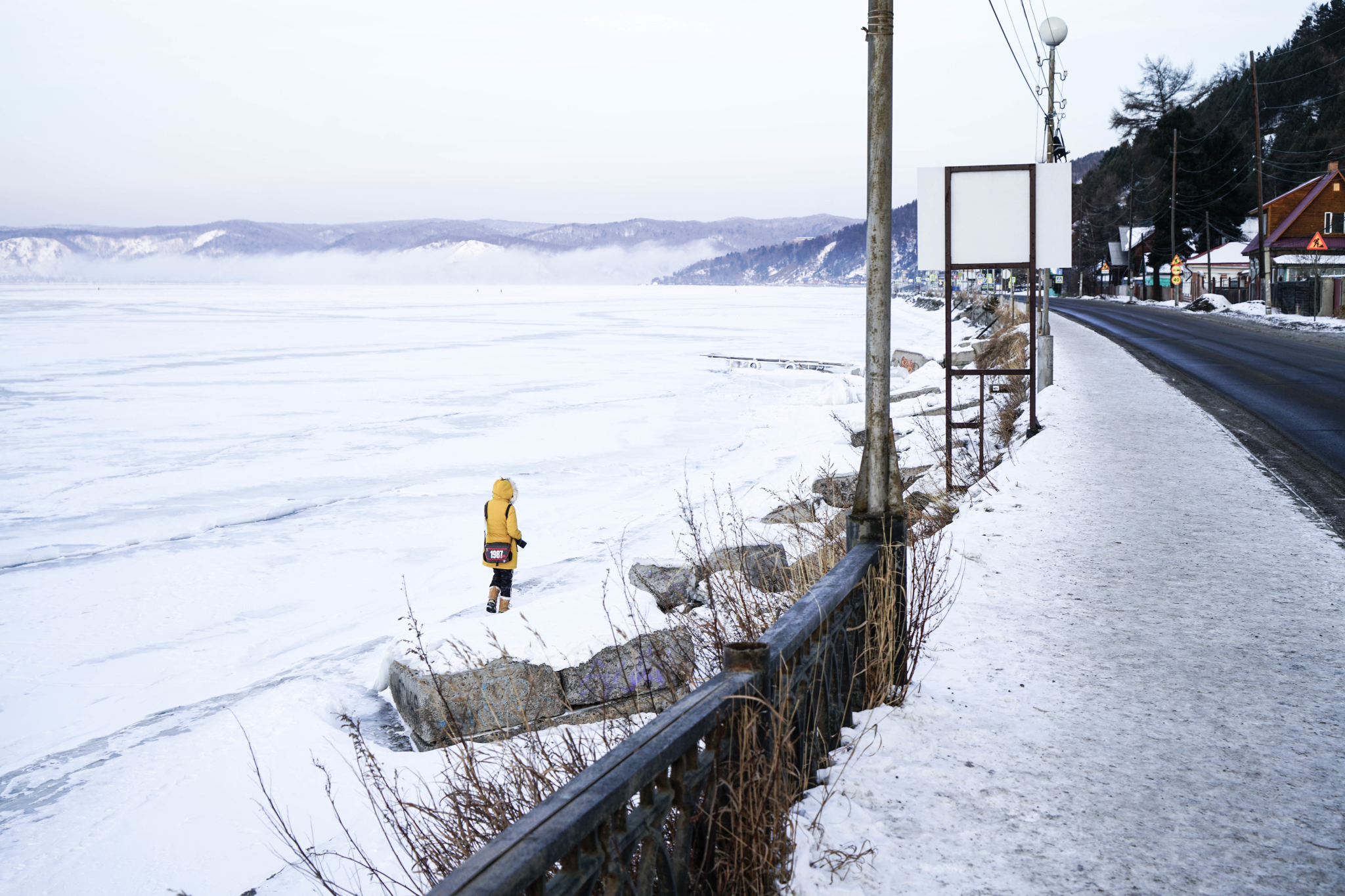 清晨,我拖着巨大的行李箱,怀抱着厚重的三脚架(是的,我买了新的三脚架啦!看过我格鲁吉亚游记的同志们应该知道,之前那个三脚架不堪重负,耐不住强风,为防重来一次惨痛经历,所以买了个又重有坚硬的新架子)伊尔库茨克冬日清晨很冷,风也如同前一晚一样猛烈我逆着风,举步艰难地再多重询问下走到中央市场的巴士站,前往附近出名的小渔村:利斯特维扬卡。