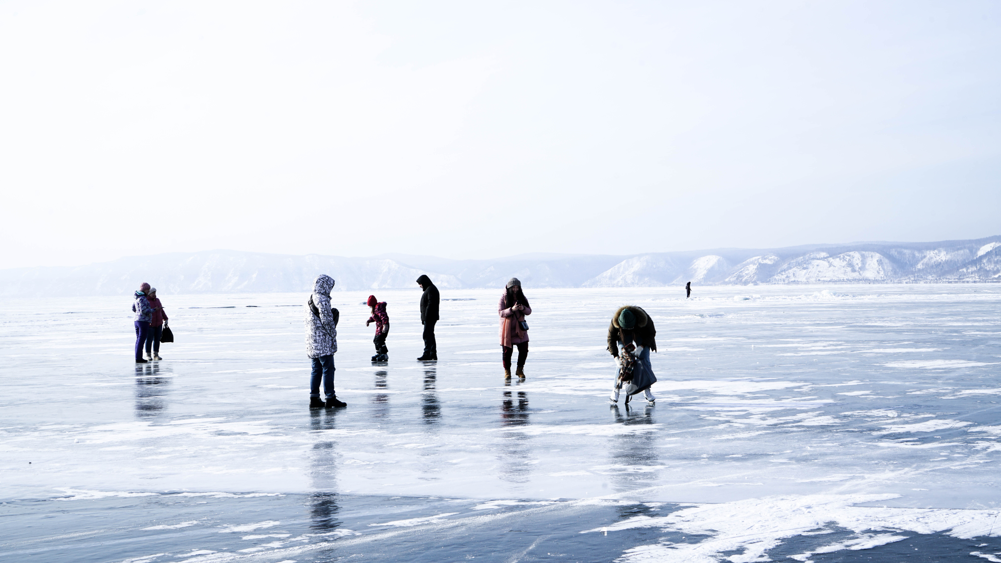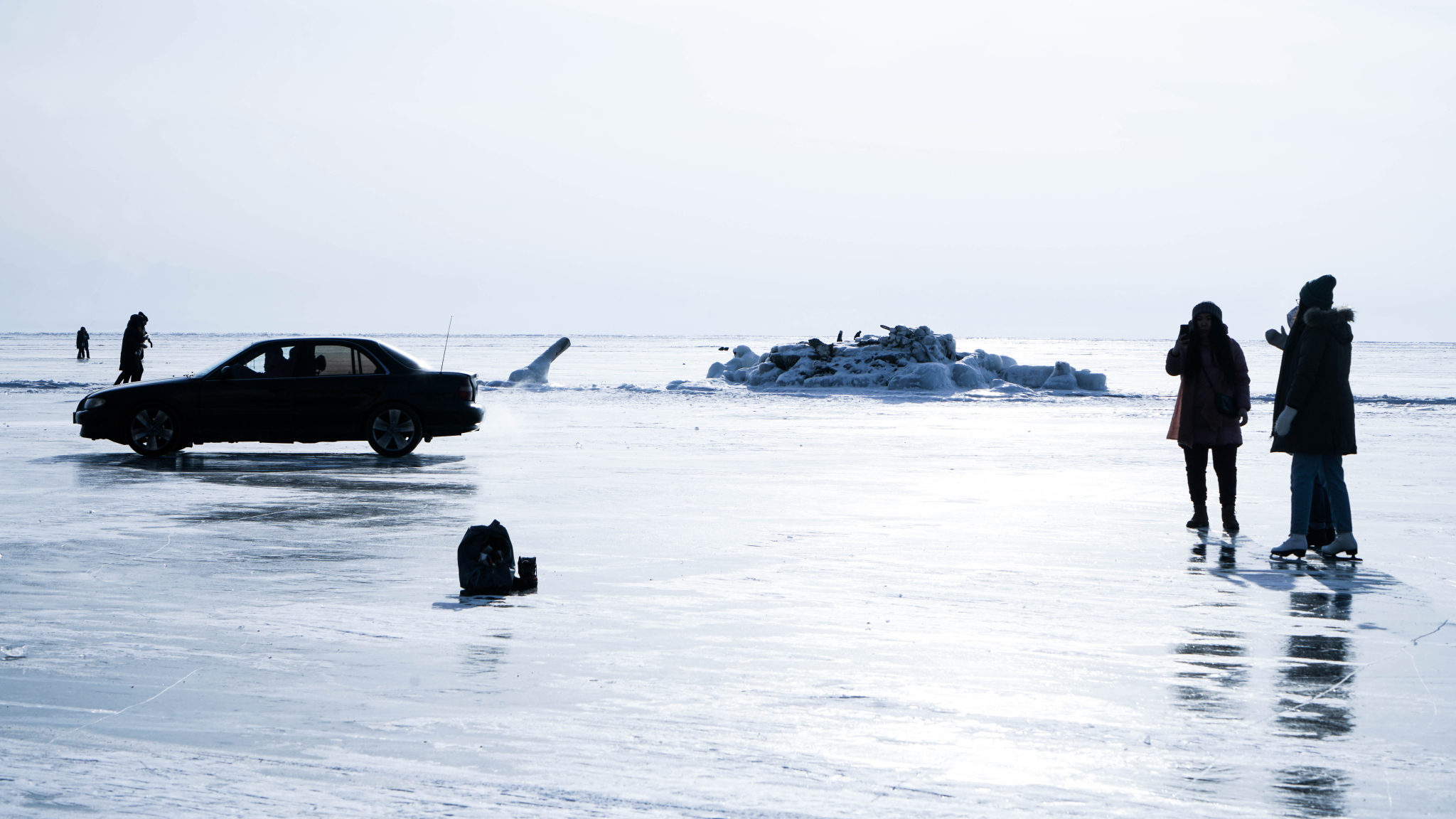 湖面上到处能见玩耍的人们。汽车在冰面上滑出呼呼沙沙的响声,尾气卷起白烟,车内的人欢呼着笑着闹着。