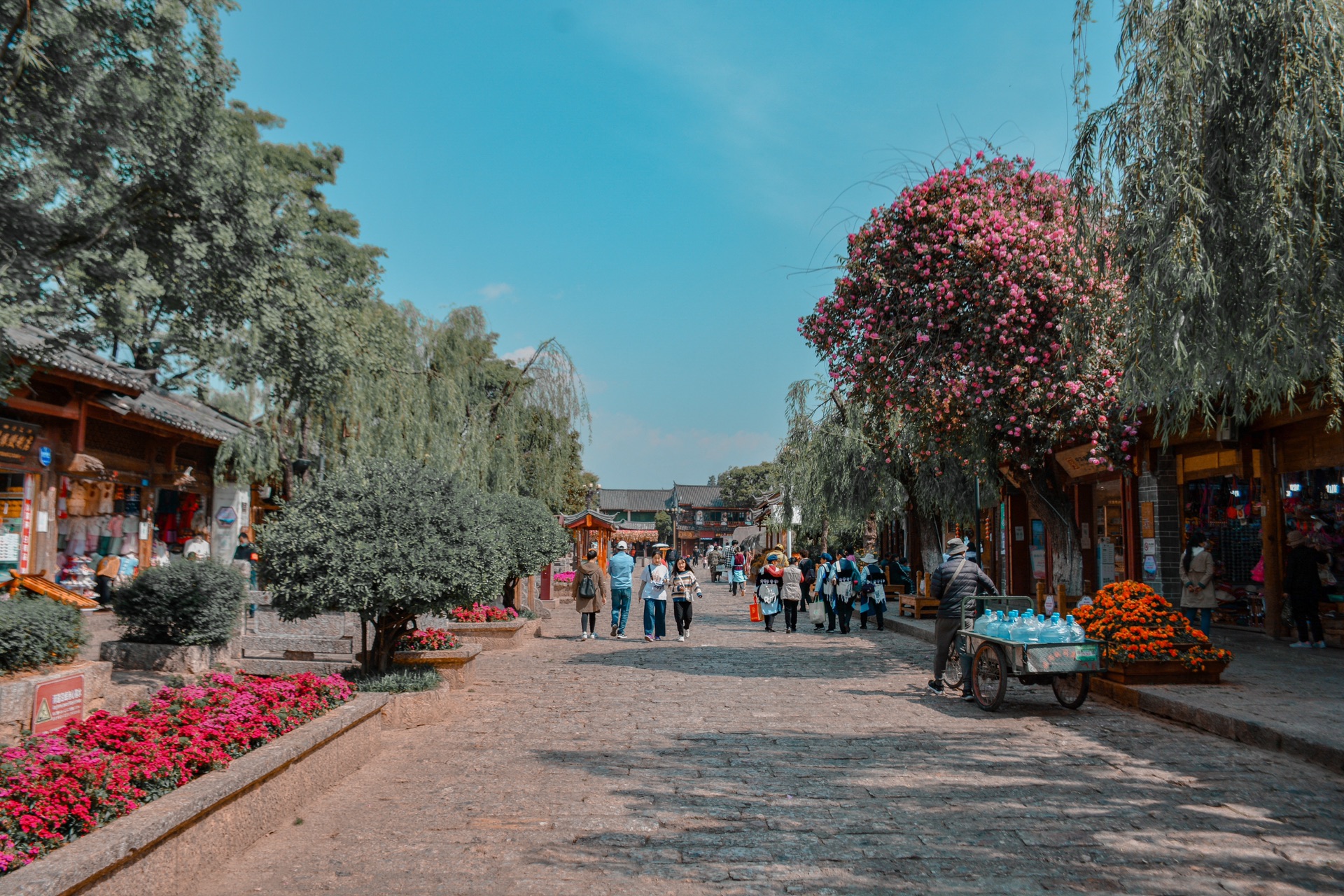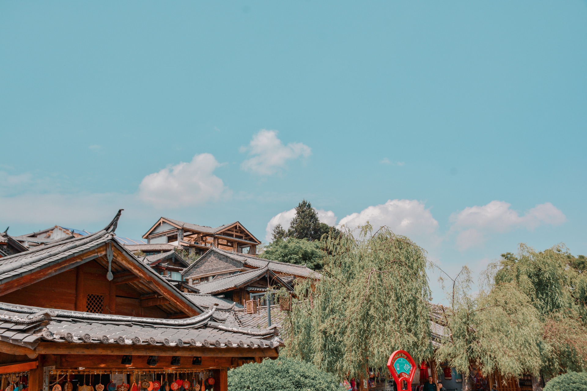 半年后再次来到丽江古城没有了第一次踏上青石板砌成街道的新鲜感,取而代之的是多了一丝熟悉的味道。碧柳垂街,店铺鳞次,天空也比上次更蓝了,湛蓝的天空上漂浮着朵朵白云,仿佛醉酒的谪仙人肆意捏造而成。