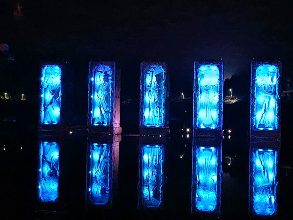 演出剧场内部,是一片平坦的空地,两侧是高高的塔楼,中间有5尊石雕,分别雕刻着三国时期蜀国的五虎上将:关羽、张飞、马超、黄忠、赵云。当然,观看完演出后你就会发现,这5尊石雕可不仅仅是石雕那么简单