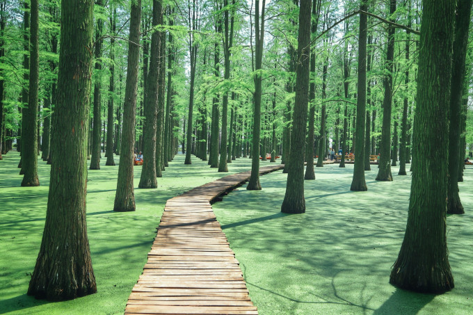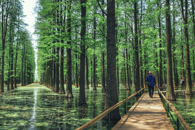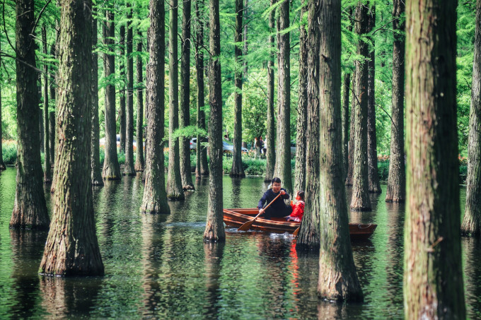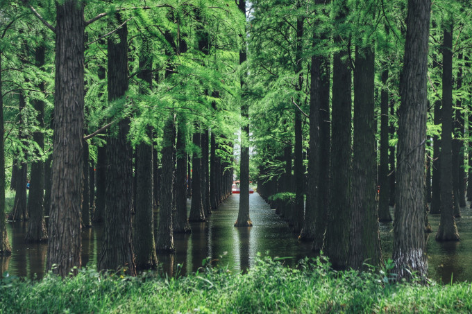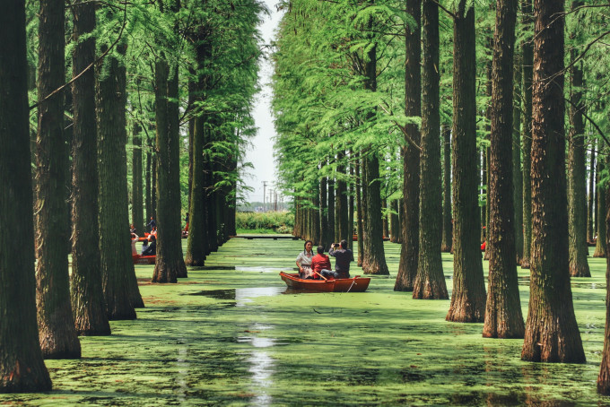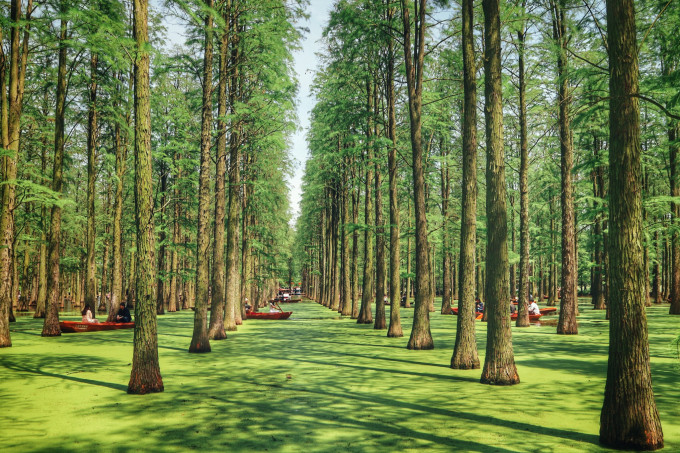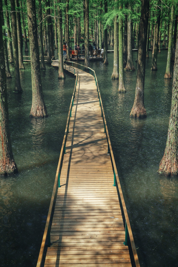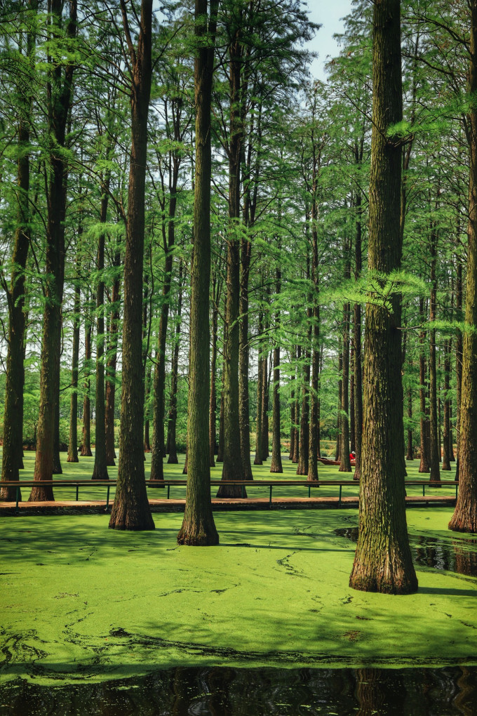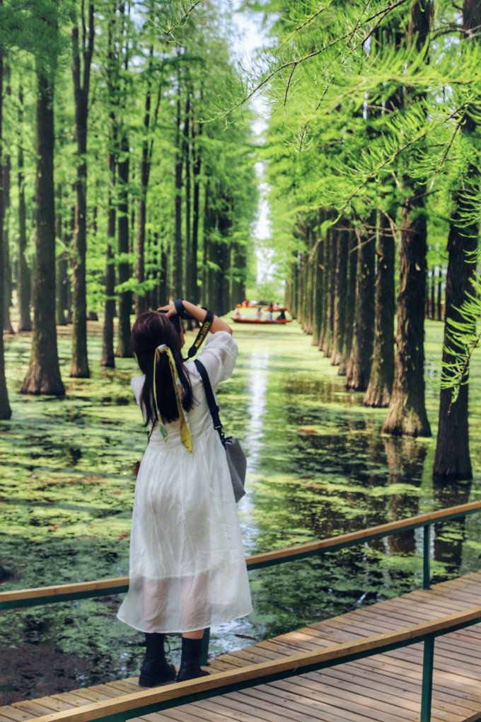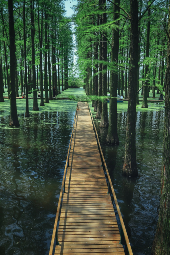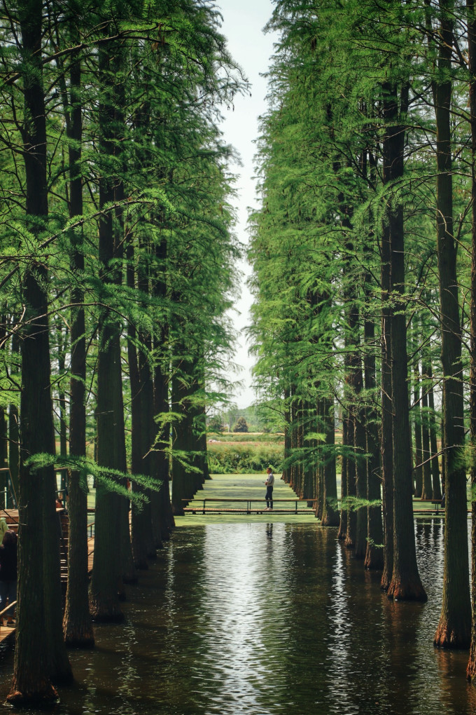 高大的水杉直耸入云霄,阳光从缝隙倾斜而下洒在浮萍之上,斑驳阑珊,幽深静谧,想不喜欢都好难~