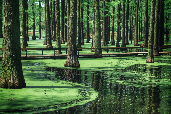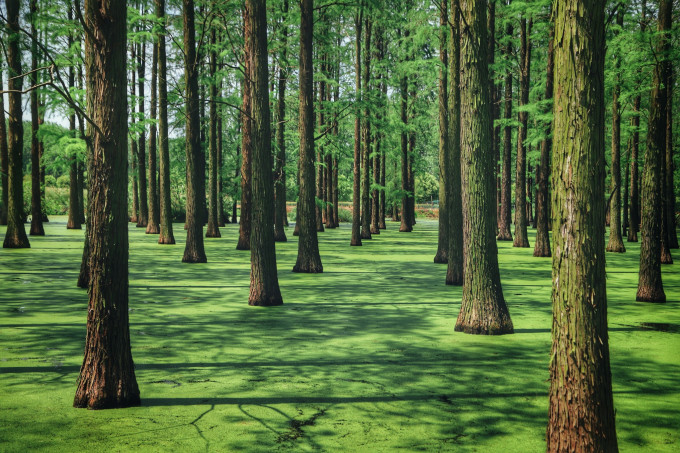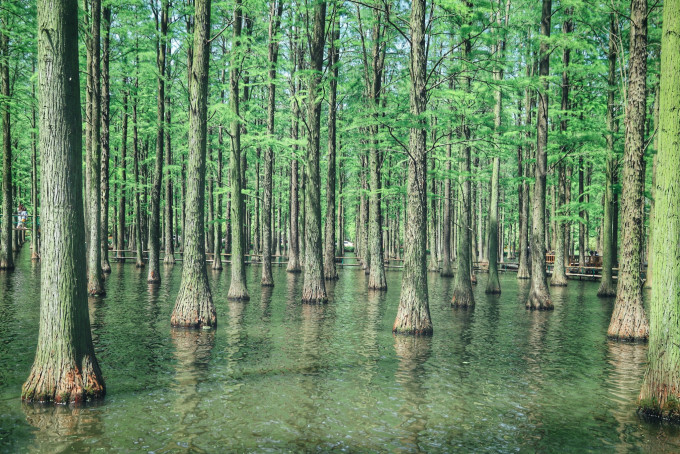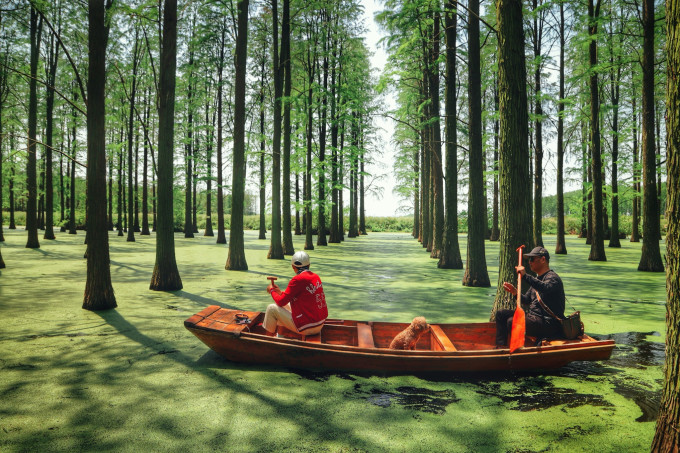抹茶糊其实并不算大,典型的水杉湿地生态,想来这里到了秋天,也将是一片金黄色,色彩应该不亚于春夏,但因为缺少了来自大地的绿色浮萍的衬托,似乎又少了一点来自“人间”的色彩。