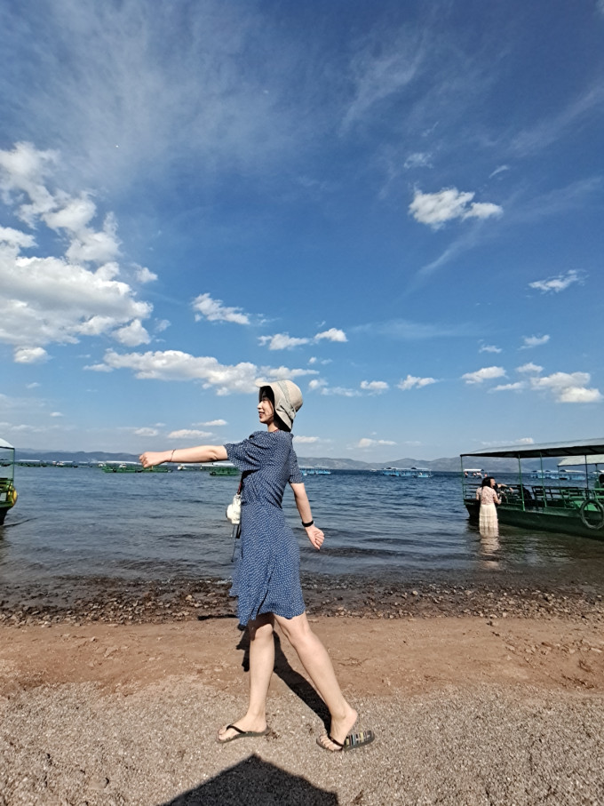 ️16:00 出发禄充风景区,每人15元门票。停车场15元一次。走一个大下坡就到沙滩边了,海滩有很多人在划脚踏船,还有快艇在湖面开。沙滩边的塑料躺椅50元一个小时,WTF?总之不值,可不来。