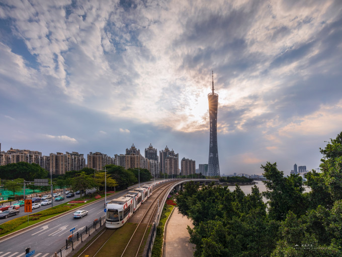 猎德大桥的经典位置,需要等电车一起拍。