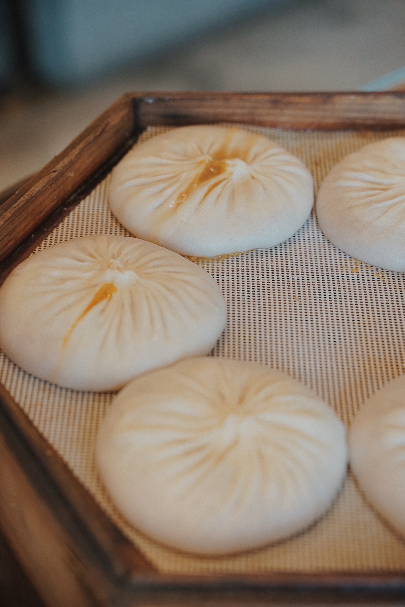 自助下单十来分钟后,服务人员会将热气腾腾的蟹黄汤包用笼屉端到客人面前。从蒸笼中将汤包抓取到盘碟中,是一项绝对的“技术活”,稍不留神就汁水四溅。大概是因为季节的关系,初夏时节吃的汤包从汤汁色泽到馅料内容、鲜美度上都与入秋之后略有逊色。南之缘的汤包以汤汁居多,汤汁鲜美,因为经过调味,各种味道的比例更加均衡。汤包皮属于适中偏硬,早餐的汤包也许是前一天晚上提前包好的,底部很容易破裂。