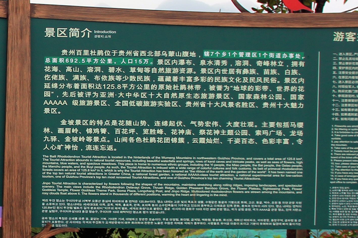 百里杜鹃景区共分为普底景区、金坡景区两大核心景点,周边还有奢香军营山地公园、彝山花谷、百里杜鹃湖、米底河景区、杜鹃花王景区、戛木景区等景区。因盛花期已过,我只游览了“金坡景区”。金坡景区包括大门、百花坪、画眉岭、马缨林、金坡岭等景点。