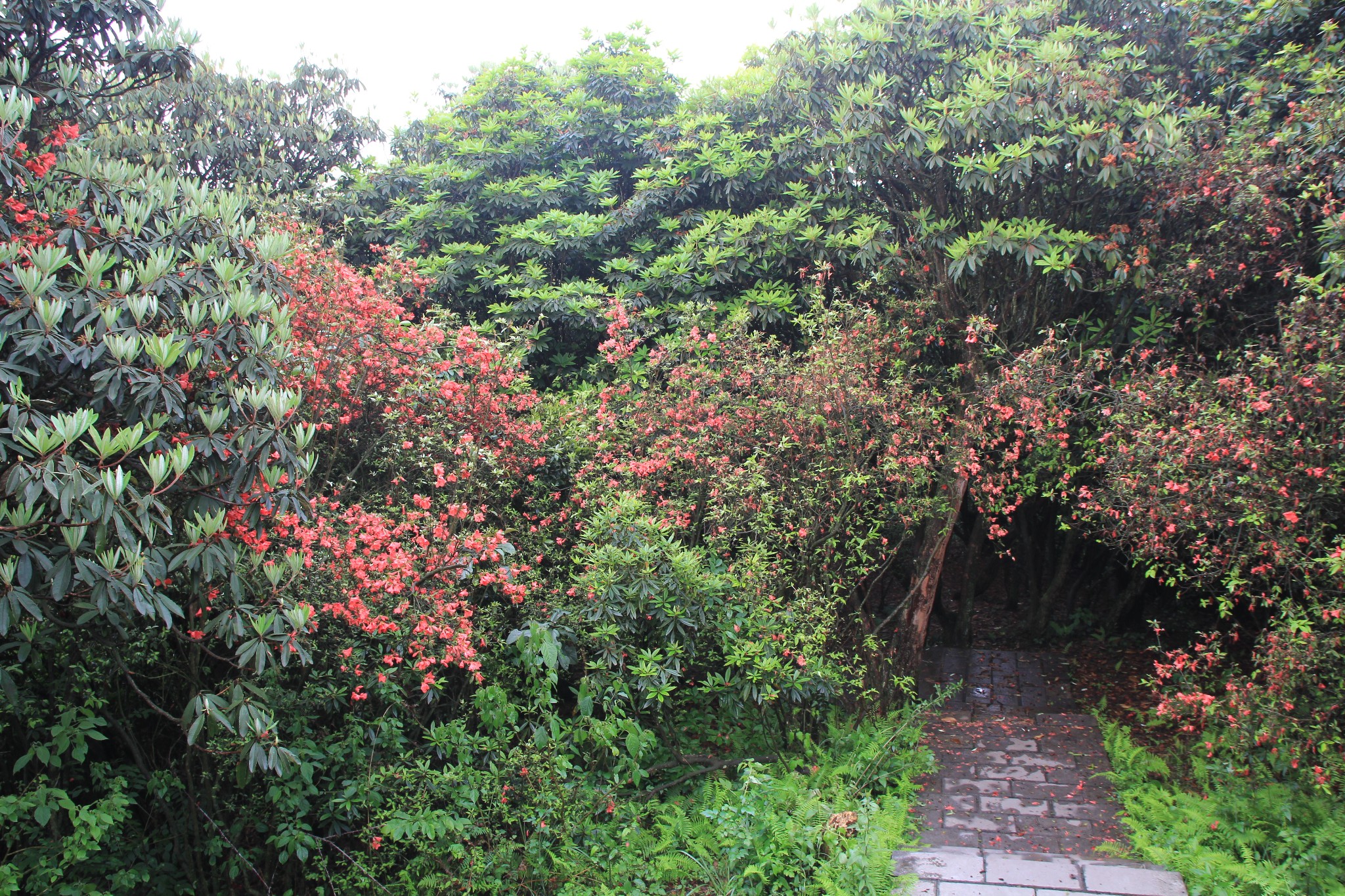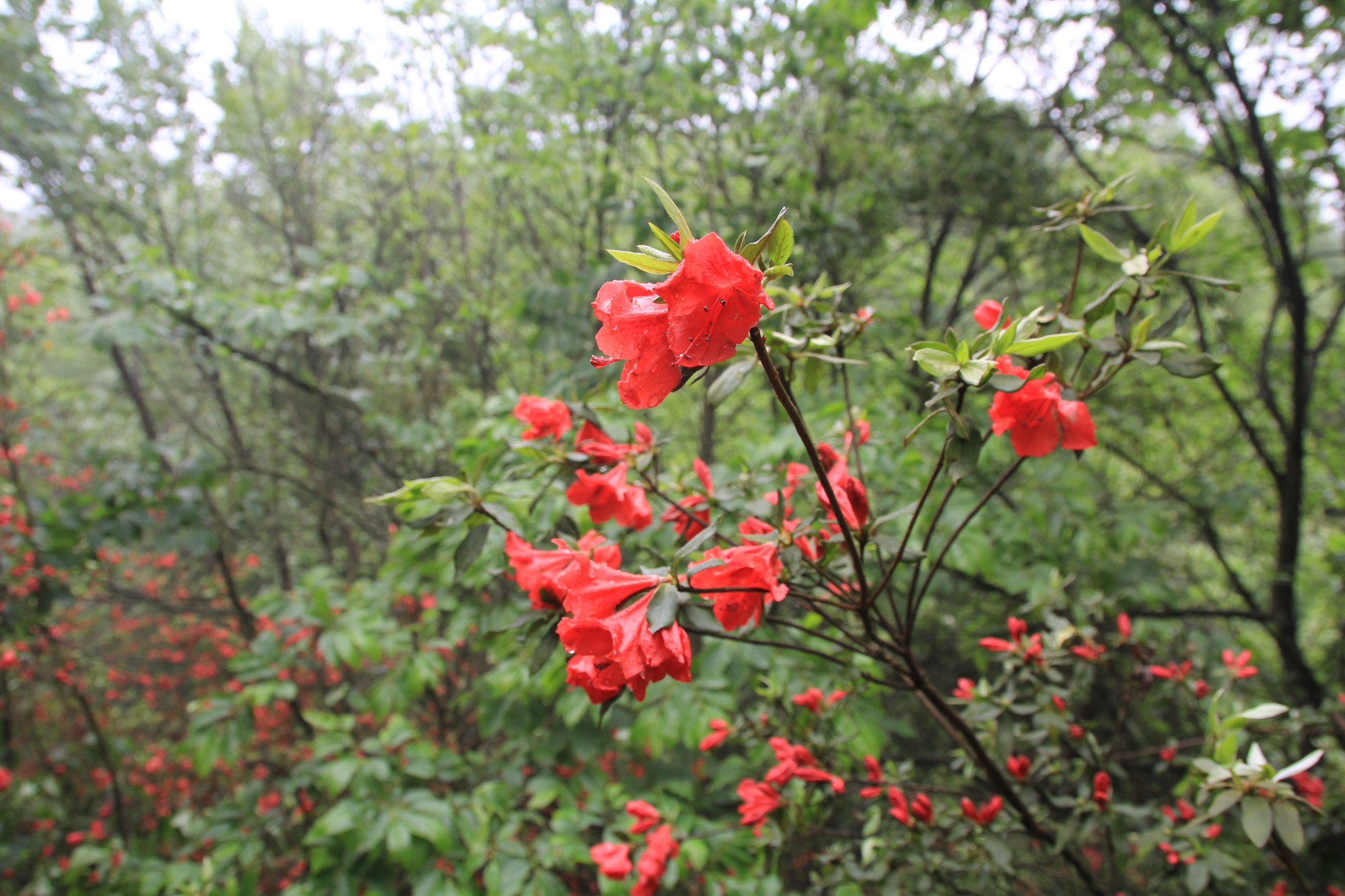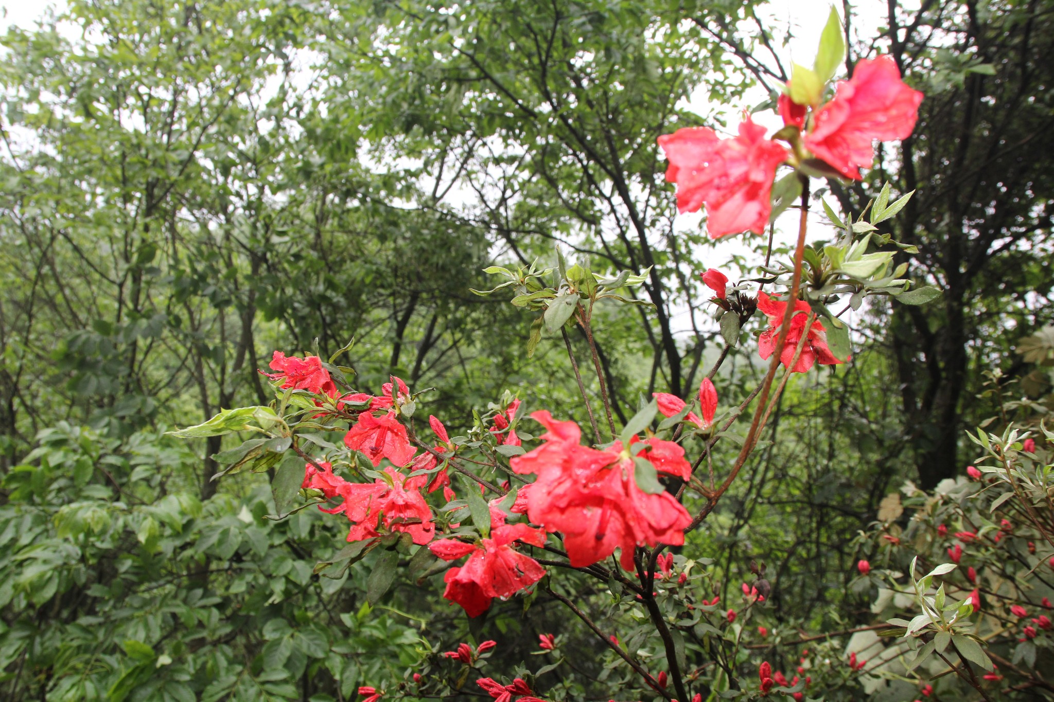 沿着观光步道独自一人寻花而去。大片的杜鹃花树已是枝叶苍翠,还有少量的杜鹃花(以映山红为多)依然艳丽,构成了一幅幅美丽的画卷,汇集如下: