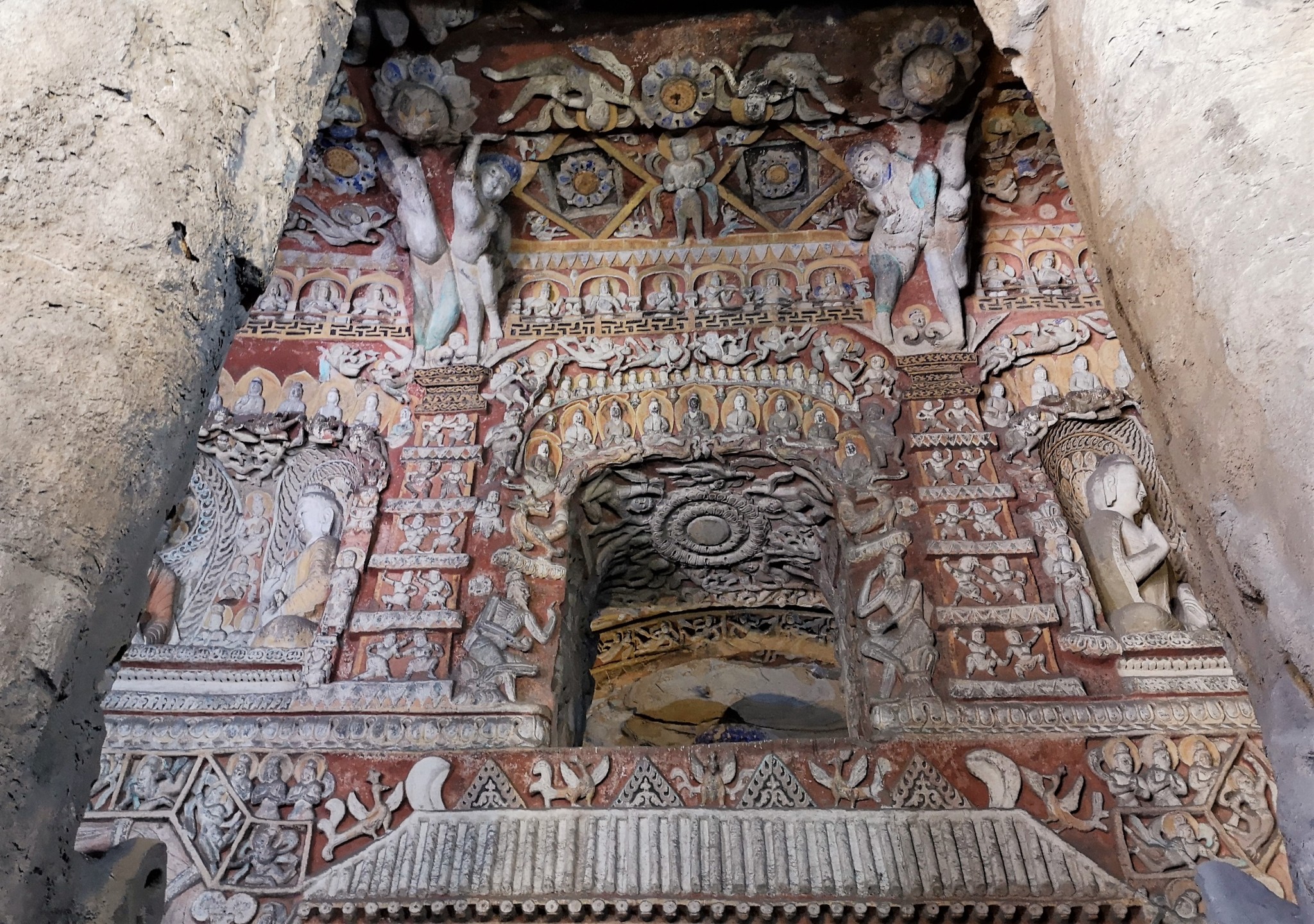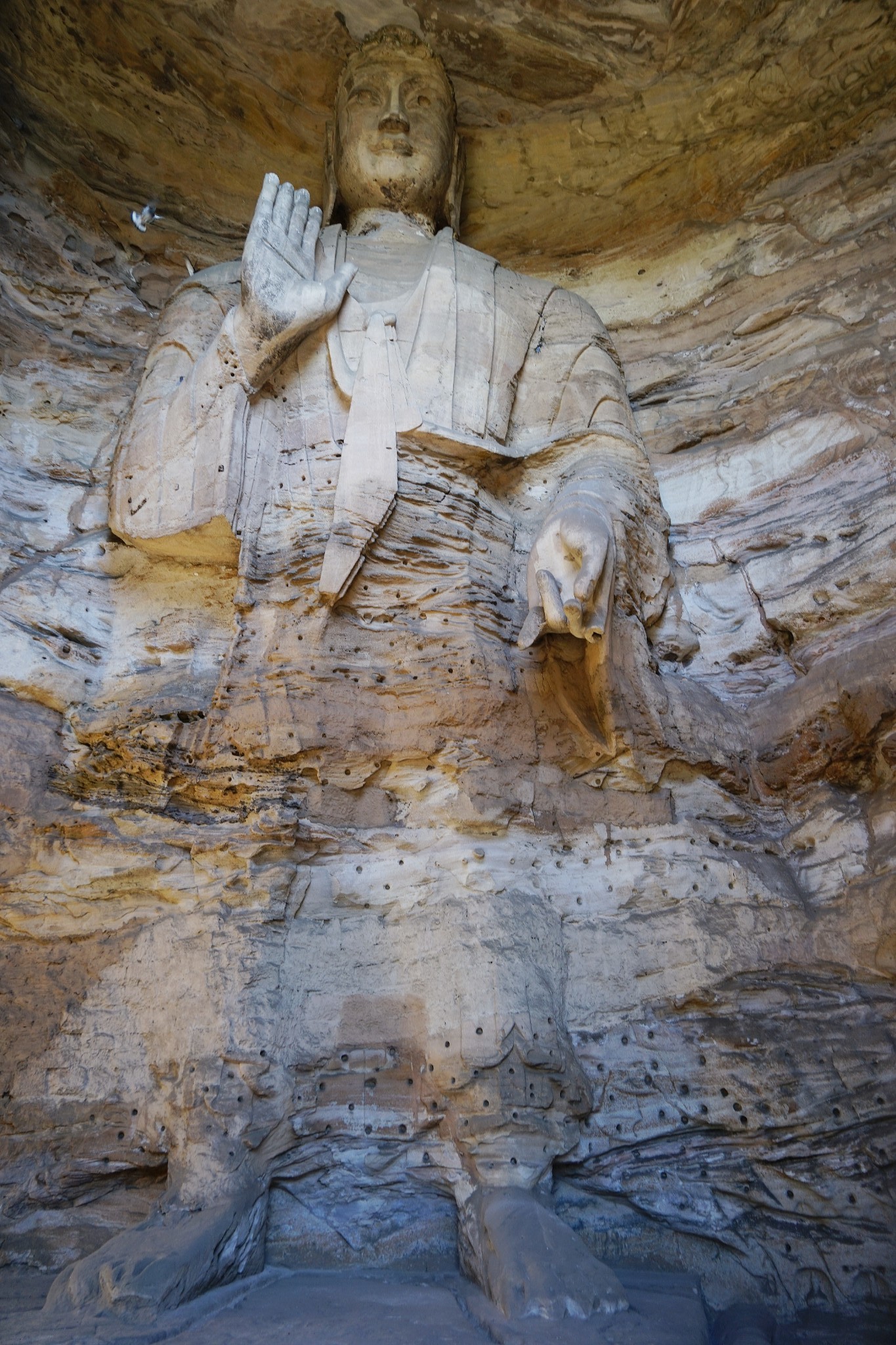 云冈石窟大型造像众多,壁面雕刻精美,其中以“昙曜五窟”(第16-20窟)最为著名,为云冈石窟的一期工程。第16窟立佛洞的主像为释迦立佛,高13.5米,胸前结带下垂,但是下半身已经严重风化。